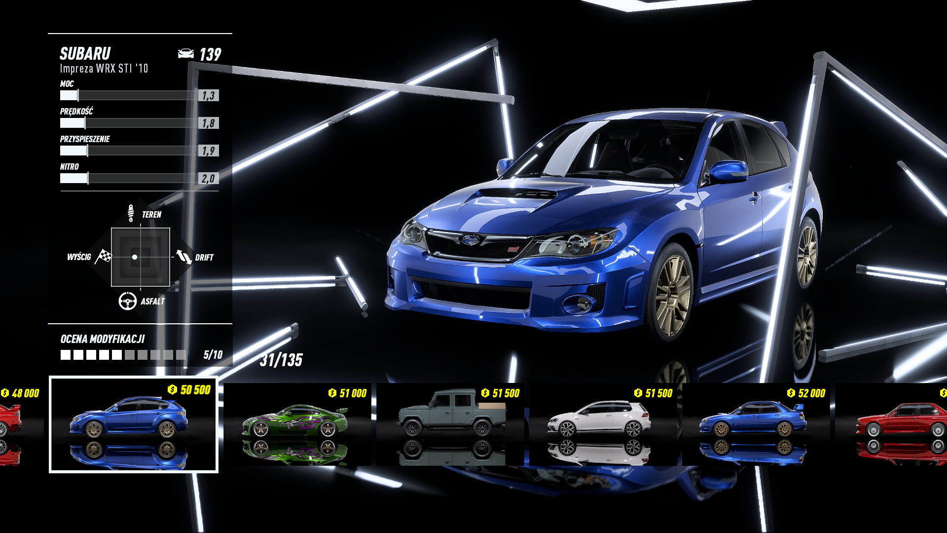 | Subaru Impreza WRX STI | 2010 | Rajdowy | 139 | 50,500 | 305 | 584 | 5/10 | Osiągnij 24 poziom REP | Podstawowa wersja gry | |