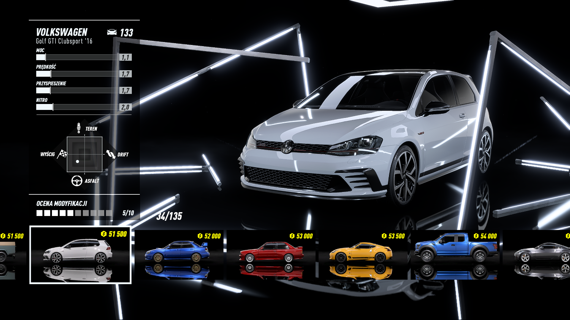 | Volkswagen Golf GTI Clubsport | 2016 | Hot hatch | 133 | 51,500 | 261 | 581 | 5/10 | Osiągnij 20 poziom REP | Podstawowa wersja gry | |