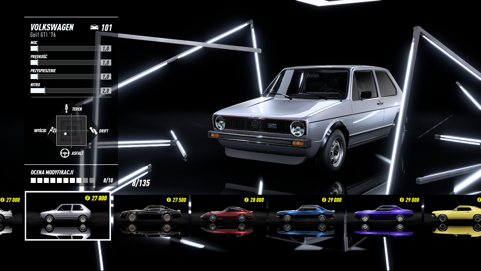 | Volkswagen Golf GTI | 1976 | Hot hatch | 101 | 27,000 | 110 | 488 | 8/10 | Osiągnij 22 poziom REP | Podstawowa wersja gry | |