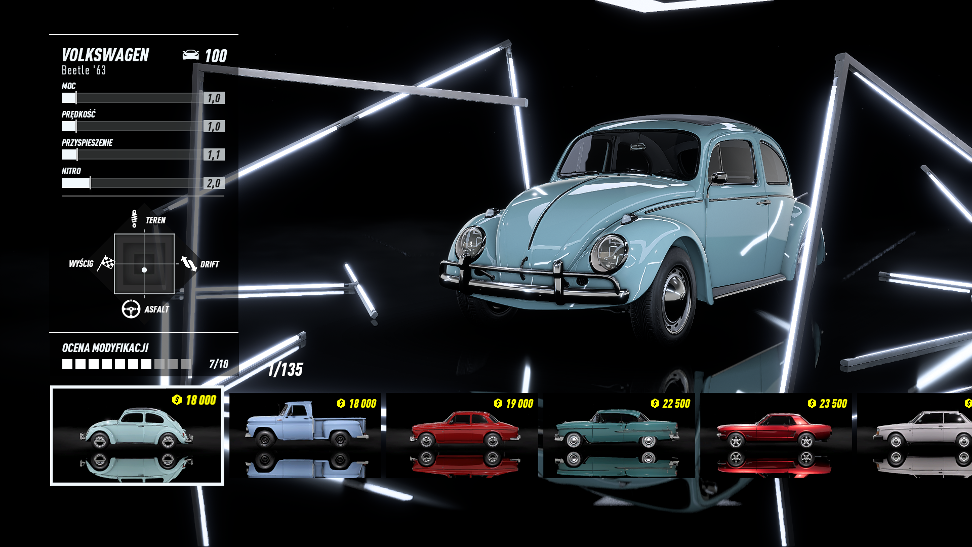 | Volkswagen Beetle | 1963 | Hot hatch | 100 | 18,000 | 101 | 386 | 7/10 | Osiągnij 22 poziom REP | Podstawowa wersja gry | |