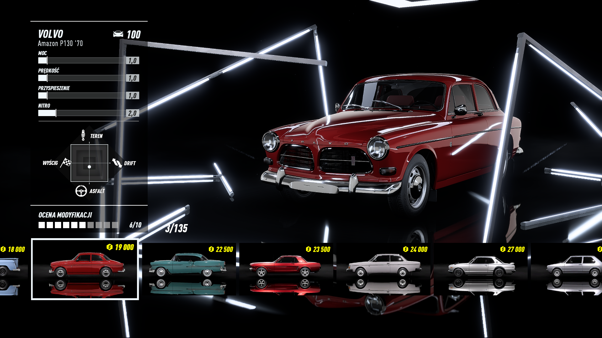 | Volvo Amazon P130 | 1970 | Klasyczny | 100 | 19,000 | 115 | 581 | 6/10 | Osiągnij 22 poziom REP | Podstawowa wersja gry |