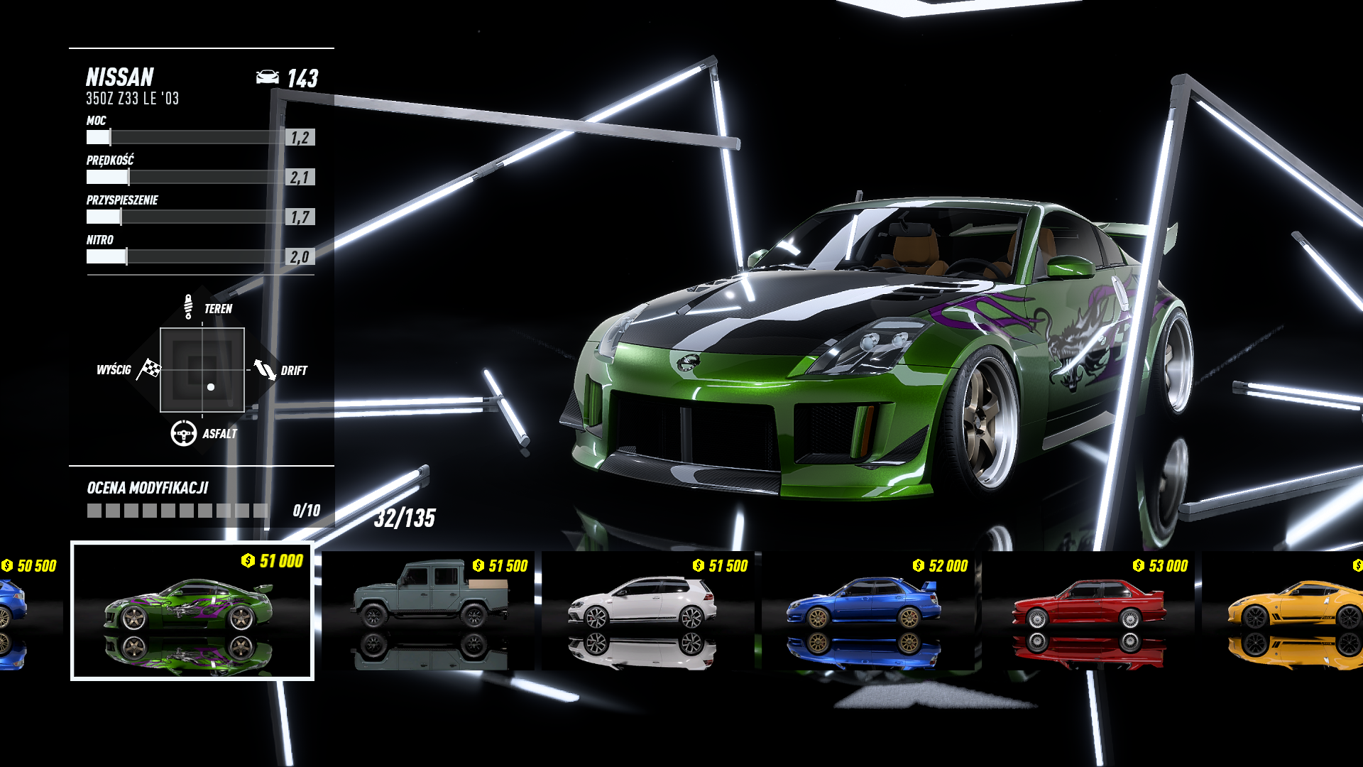 | Nissan 350Z Z33 LE | 2003 | Coupé | 143 | 51,000 | 287 | 914 | Ukończ misje driftu w trybie fabularnym | Podstawowa wersja gry |