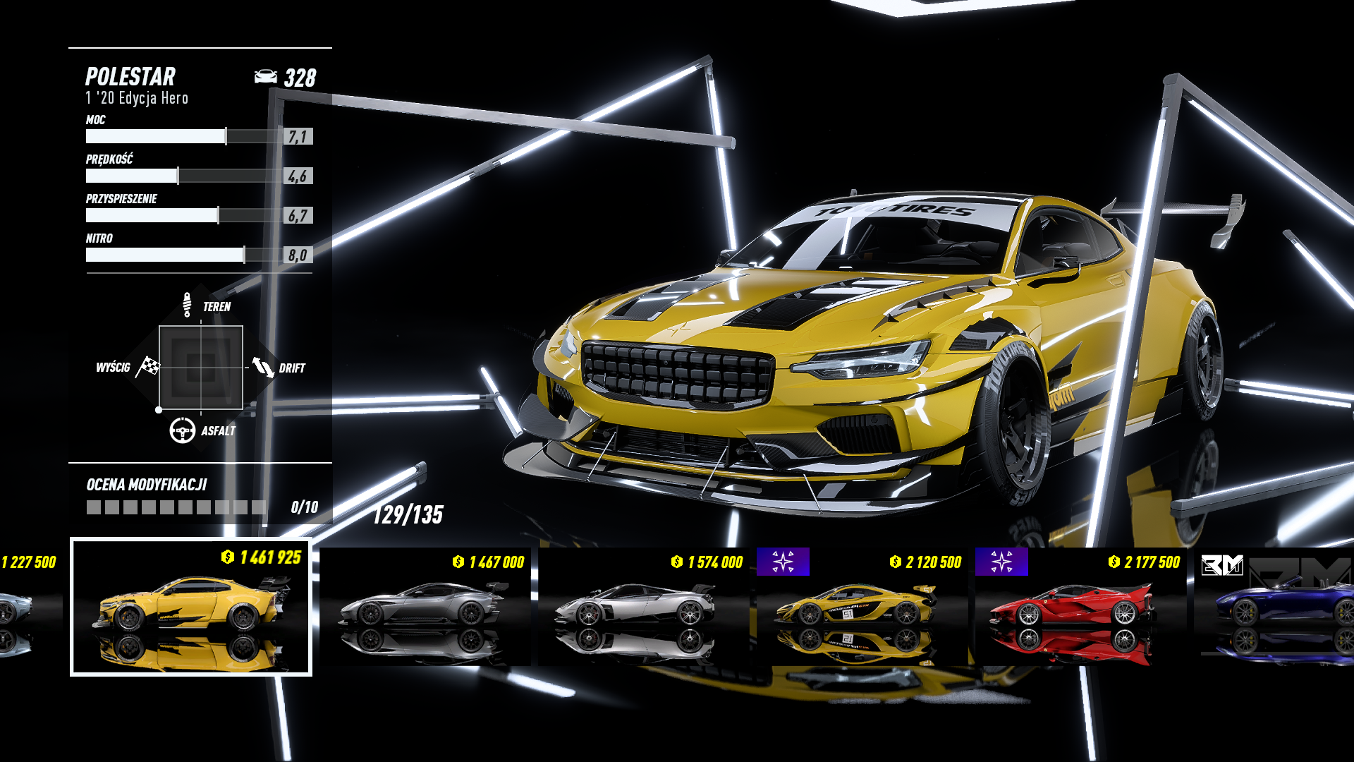 | Polestar 1 Edycja Hero | 2020 | Coupé | 328 | 1,461,925 | 778 | 1089 | Ukończ wszystkie misje fabularne | Podstawowa wersja gry |