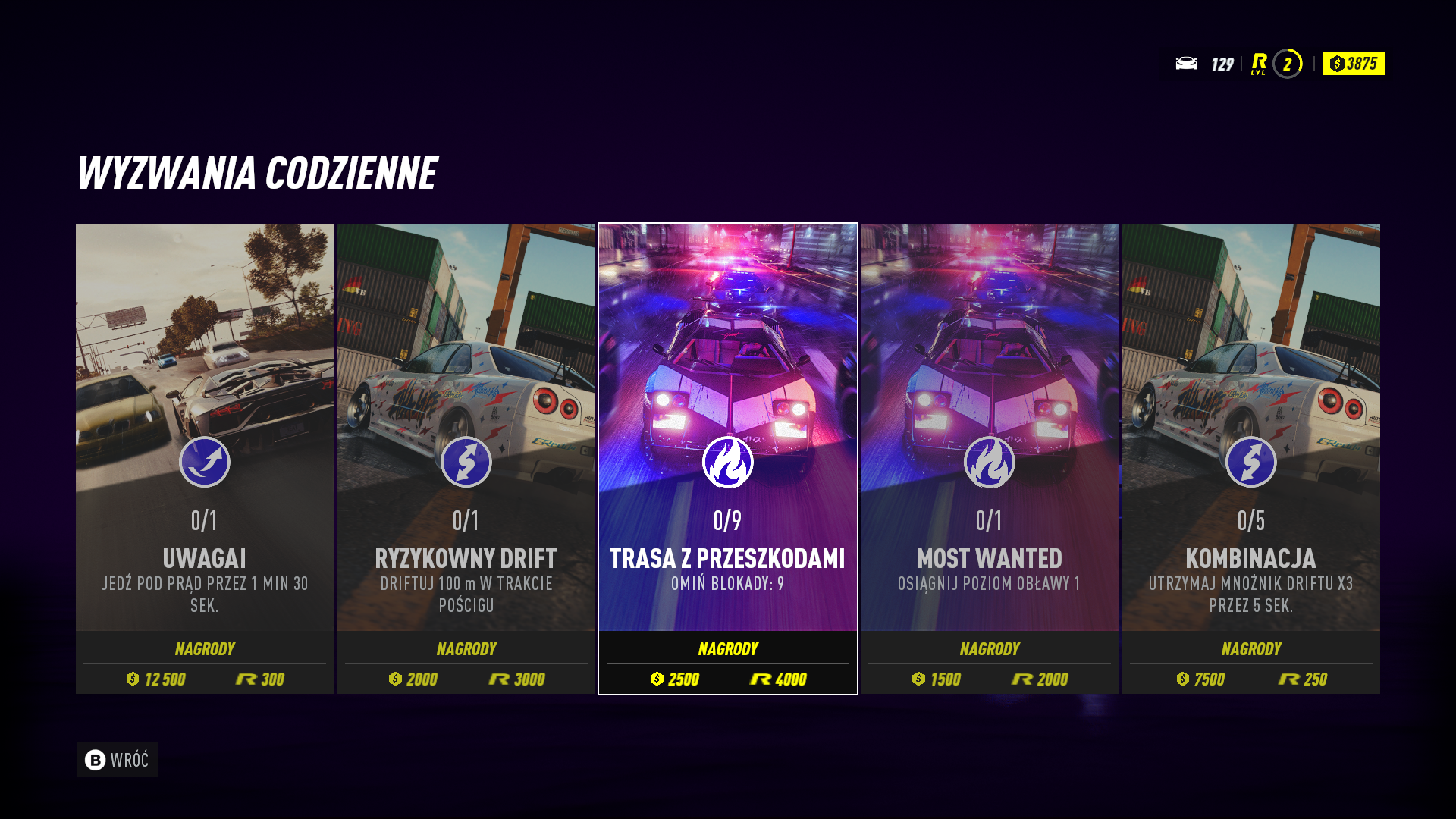 Dodatkowo każdego dnia czeka Cię 5 nowych, codziennych wyzwań. Za ukończenie każdego z nich, otrzymasz zarówno gotówkę, jak i punkty REP. Te zestawy wyzwań dostępne są cały czas.