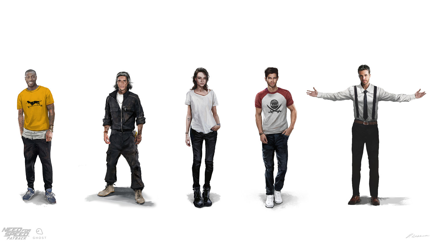Zgadza się, nad postaciami pracowaliśmy przez ok. miesiąc. Mieliśmy wstępny casting aktorów. Potem casting się zmieniał, bo niektórzy aktorzy nie mogli, inni byli za drodzy, było dużo tasowań. Ale było z góry określone, że ma być mechanik w określonym wieku, główny bohater - chłopak w wieku 25-30 lat, luźny styl, kobieta z lekkim pazurem, itp. I na podstawie szczegółowych wytycznych od mojego art. dyrektora, robiłem koncepty różnych wariacji, różnego ubioru, łącznie z kolorami oraz wzorami koszulek i spodni. Oczywiście w wyniku zmian obsady musiałem na wcześniej stworzone koncepty nakładać twarze nowych aktorów.