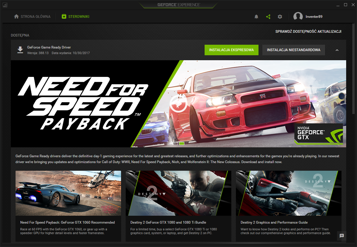 Koncern nVidia udostępnił nowe sterowniki Geforce z linii Game Ready Driver. Wersja 388.13 zawiera optymalizację pod Need for Speed Payback.Posiadacze kart zielonych mogą pobrać najnowszą paczkę sterowników przez Geforce Experience. Dla lepszych wyników wydajności w grze warto wykonać czystą instalację sterowników.