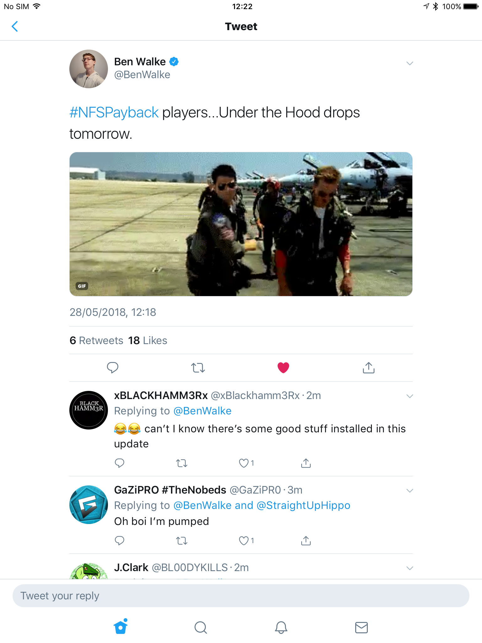 Na początku miesiąca otrzymaliśmy informacje o kolejnym wpisie Pod Maską. O ile prawdą się okazały informacje, że Ben Walke - koordynator globalnej społeczności Need for Speed zamierza go napisać, to data jego publikacji się nie sprawdziła. Teraz poznaliśmy potwierdzenie od niego samego, kiedy pojawi się nowy wpis.Niemalże każdego dnia Ben Walke jest pytany o nowe informacje dotyczące aktualizacji NFS Payback. Dotąd przypominało to trochę walenie głową w mur, ponieważ zostawały one bez odpowiedzi. Wszystko zmieniło się wczoraj. O 21:34 czasu polskiego Ben Walke na kolejne pytanie o nowej aktualizacji odpisał W następnym tygodniu wleci Pod Maską. Tam wszystkie informacje. A przed chwilą na Twitterze doprecyzował, że kolejny wpis Pod Maską pojawi się już jutro!