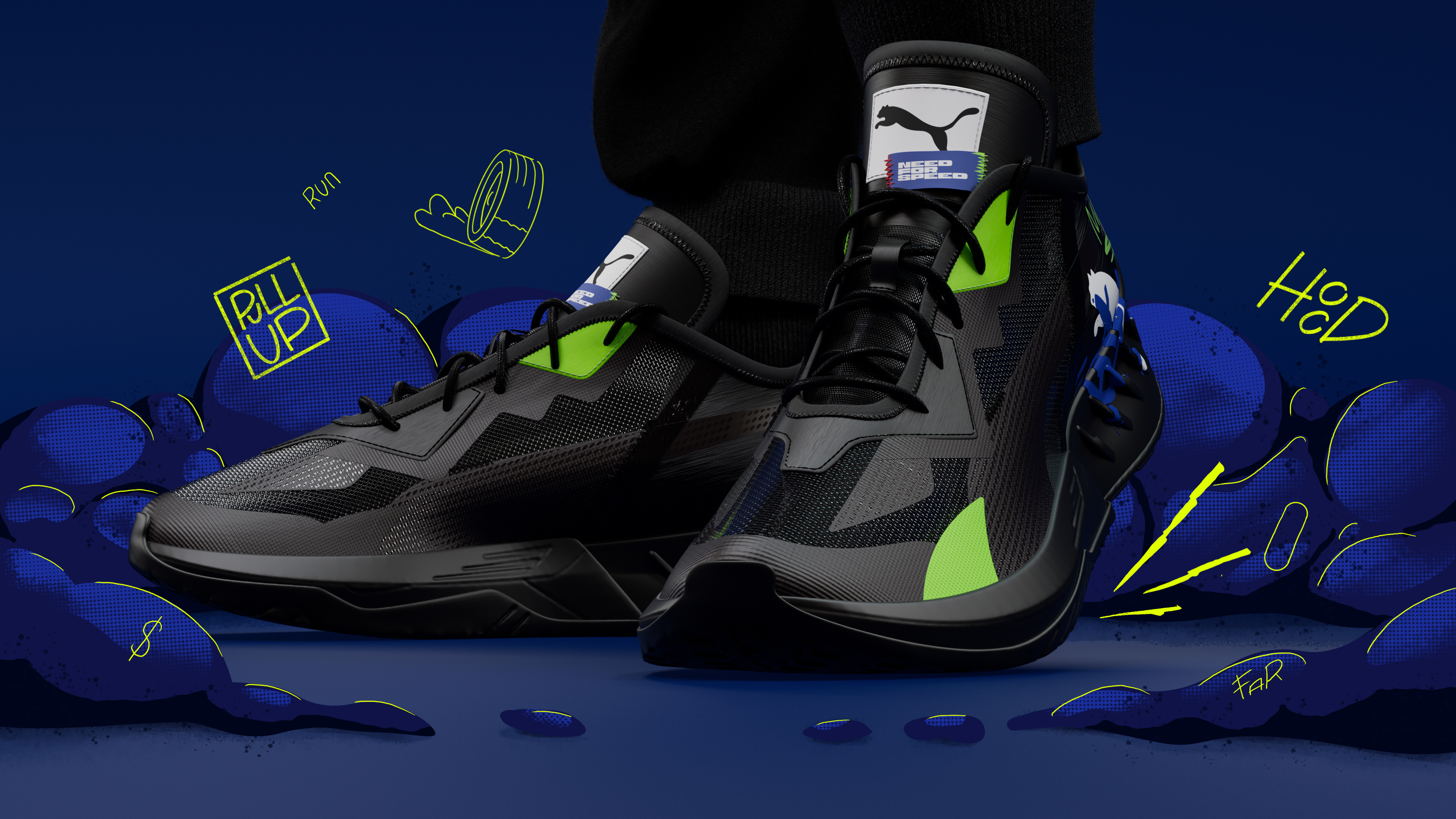 Kolorem przewodnim kolekcji jest charakterystyczna czerń PUMA Black. Z kolei inspirowane graffiti logotypy Need for Speed zyskują nowe życie dzięki zastosowaniu niebieskiego PUMA Blue, a klasyczna biel PUMA White ozdobi kultowe logo „Forever Faster". Kolekcja została zaprojektowana tak, by doskonale sprawdzać się zarówno na ulicy, jak i wciskając wirtualny gaz do deski. Obejmuje ona dwie bluzy z kapturem, dwie koszulki oraz specjalnie zaprojektowane spodnie dresowe NFS. Fani mają do wyboru cztery rodzaje obuwia, w tym specjalne edycje kolorystyczne NFS modeli PUMA MACO SL, RS-X, RS-TRK i RS-X JR. Do kompletu dostępna jest także specjalna czapka z daszkiem.