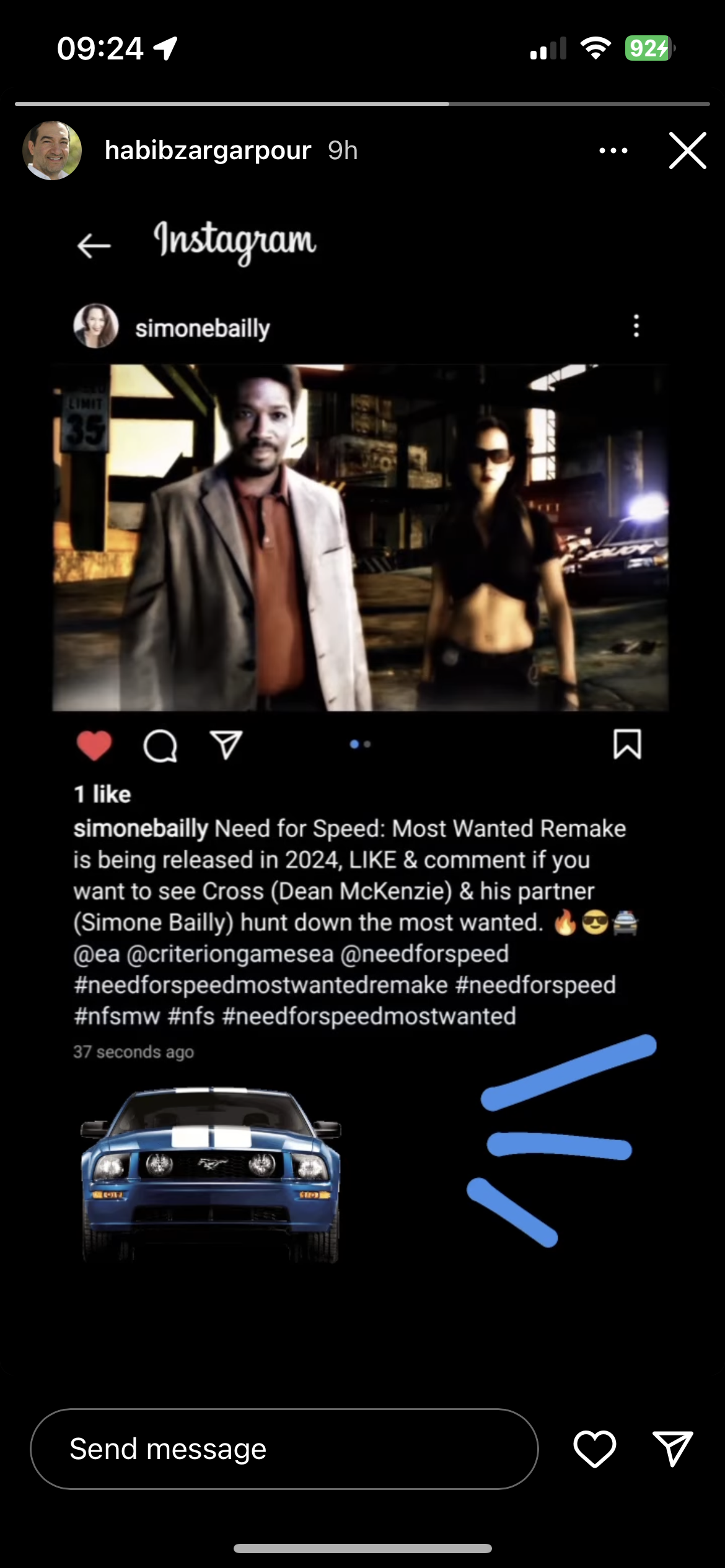 I dziś w nocy Simone Bailly - aktorka, która w Most Wanted 2005 zagrała partnerkę sierżanta Crossa umieściła na swoim instagramie bardzo jednoznaczny post, który po kilku chwilach usunęła. Aktorka napisała, że Most Wanted jako remake zostanie wydany w 2024 roku. Ponadto oznaczyła konta EA, Need for Speeda oraz Criterion Games - studia, które teraz trzyma pieczę nad serię Need for Speed. Ale w internecie nic nie ginie. Zaledwie po 37 sekundach od publikacji, pierwszy zaserduszkował i screena posta zrobił Habib Zargarpour - Senior Art Director w EA w latach 2003-2010. Pracował on przy produkcji kilku części NFS, m.in. przy Most Wanted (2005). Przypadek?