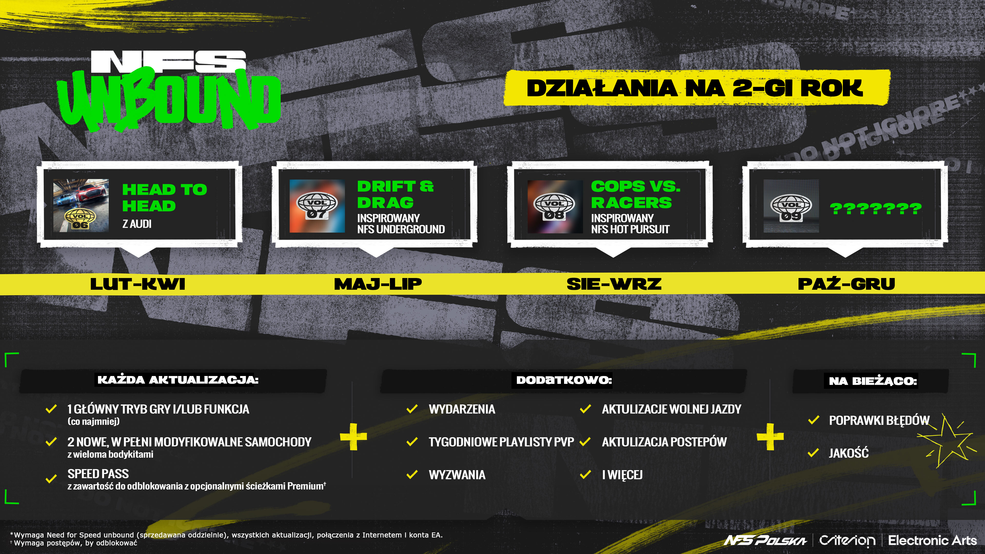 W tym roku ukażą się 4 główne aktualizacje, a każdy z nich będzie ukazywać się co kilka miesięcy. Ich celem jest dostarczenie ekscytujących aktualizacji tematycznych, z co najmniej jednym nowym trybem głównym dodanym do każdej aktualizacji. Każda aktualizacja wniesie do gry coś nowego. Zostanie dodanych więcej wydarzeń, więcej wyzwań, nowa zawartość, rangi do zdobycia i nowy postęp do ścigania. W ramach Speed Pass pojawią się co najmniej dwa nowe, w pełni konfigurowalne samochody. A gdy mowa o samochodach, to są to samochody NFS – nie tylko podstawowe modele z opcją malowania – mowa o samochodach wyposażonych w pełni konfigurowalne zestawy karoserii z niezliczoną ilością wymiennych części, dzięki czemu każdy gracz może go stuningować według własnego uznania.