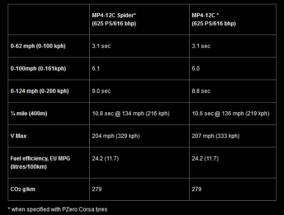 W osiągach również nie jest najgorzej - różnice między oboma wersjami są minimalne. Zwiększenie masy o 40 kilogramów nie odbiło się negatywnie na przyspieszeniu - odkryty MP4 nadal rozpędza się do setki w 3,1 sekundy. Prędkość maksymalna uległa jednak minimalnemu zmniejszeniu - wynosi ona 329 km/h (w stosunku do 333 km/h u coupe). Zużycie paliwa? 11,7 litra na setkę. W praktyce różnice te i tak zapewne nie dadzą o sobie żadnych znaków.