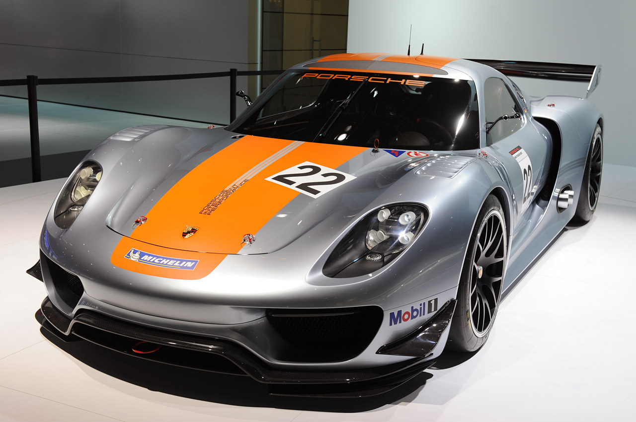 Otóż Porsche zaprezentowało właśnie wersję torową konceptu 918 Spyder, a nazywa się to... 918 RSR. Czyli podobnie, jak torowa wersja popularnej 911'tki. Tutaj jednak mamy coś nieco innego: w końcu zwykła wersja 918 jest hybrydą, więc czemu torowy Spyder miałby nią nie być? I tak mamy napęd o łącznej mocy 767 koni mechanicznych. A z czego składa się napęd? Z silnika V8, o mocy 563 KM, która uzyskiwana jest przy aż 10.300 obr./min., który wspomagany jest przez dwa elektryczne - znajdujące się przy przednich kołach - o mocy po 75 kW każdy (tyle może każdy z nich dostarczyć), co daje maksymalnie 150 kW. Moc maksymalna samochodu oszacowana jest na 767 koni mechanicznych, a więc sporo. W aucie zostało zamontowane to samo, co w 911 GT3 R - koło zamachowe. Umieszczone oczywiście zostało na miejscu fotela przedniego pasażera, tak samo, jak w wypadku innego modelu przeznaczonego na tor. Jego wirnik obraca się z prędkością do 36 tys. obr./min., czyli bardzo szybko. Ładowany jest podczas hamowania, a dwa silniki elektryczne, umieszczone na przedniej osi, działają jako generatory. Kierowca może wykorzystać tą energię poprzez naciśnięcie odpowiedniego przycisku, a dodaje to dodatkowej mocy i z pewnością pomaga przy wyprzedzaniu. Moc jest dostępna przez tylko 8 sekund. To jednak wystarczy, by nadrobić straty po np. pit-stopie.