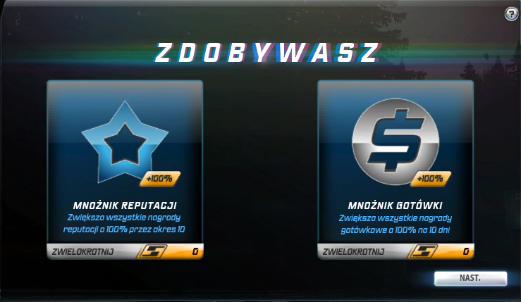 Jak wiecie serwery Need for Speed World zostaną wyłączone już 14 lipca 2015. Z tego też powodu EA w ostatnich dniach nie szczędzi na rozdawaniu obniżek na różne rzeczy.Od zeszłego tygodnia możemy kupić slot na nowy samochód wydając zaledwie 1 SB Dotychczas kosztowało to nas aż 500 SB. Dziś doszła kolejna promocja: za darmo możemy odblokować mnożnik gotówki oraz mnożnik reputacji. Mnożniki te podwajają wygraną, dzięki czemu szybciej będziemy mogli kupić samochody lub inne rzeczy za kasę z gry. By otrzymać dostęp do mnożników, należy przejechać dowolne zawody. Karty z mnożnikami pojawią się po najechaniu kursorem na punkty reputacji i gotówkę z przejechanego wyścigu. Odblokowane mnożniki będą dostępne do czasu wyłączenia serwerów.