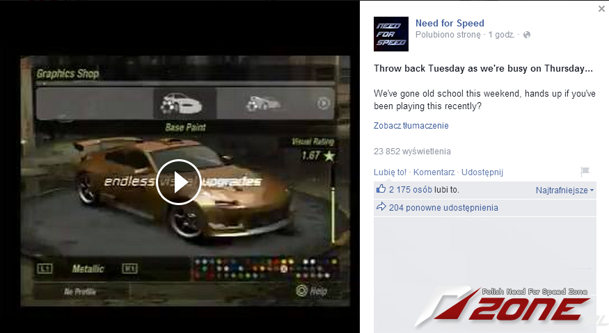 A dosłownie przed chwilą na facebookowym profilu Need for Speed pojawił się filmik prezentujący Undergrounda 2 z wpisem Throw back Tuesday as we're busy on Thursday... O co chodzi? W każdy czwartek na FB pojawiał się screen ze starego NFSa, widocznie tym razem fotka pojawi się we wtorek, gdyż w czwartek są zajęci.