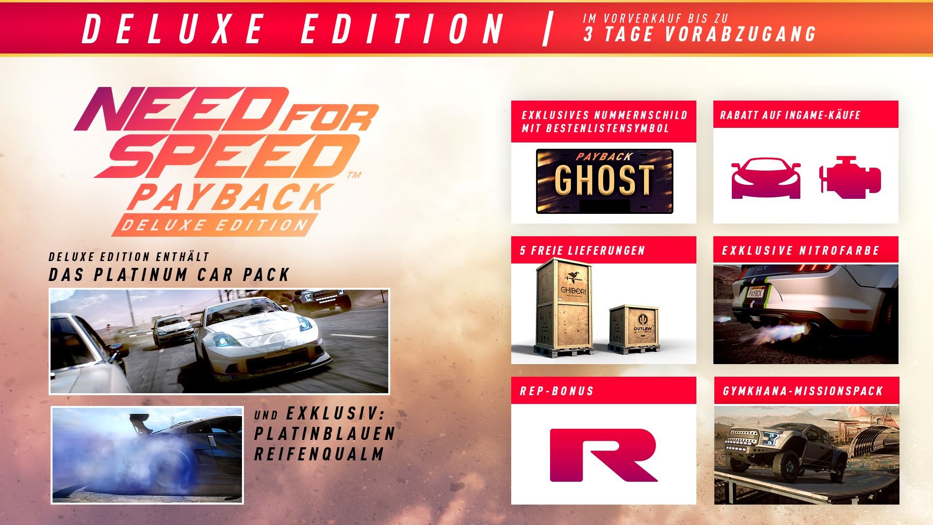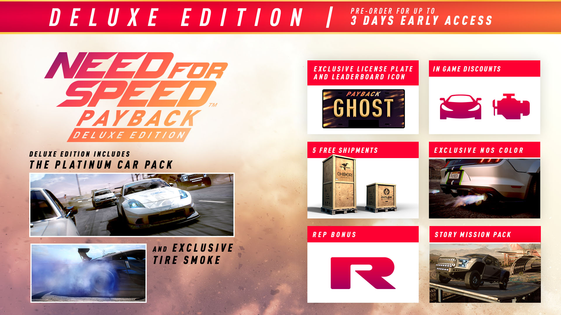 Co znajdzie się w Edycji Deluxe Need for Speed Payback wiemy od dawna, jednak teraz możemy zobaczyć jak to wygląda w praktyce.Jakiś czas temu w sklepach internetowych zaczęły pojawiać się zdjęcia z bonusami, które możemy dostać w pre-orderze i Edycji Deluxe NFS Payback. Widać na nich jak wygląda dym z opon w kolorze Platinum Blue, kolor nitro czy wyjątkowa tablica rejestracyjna.