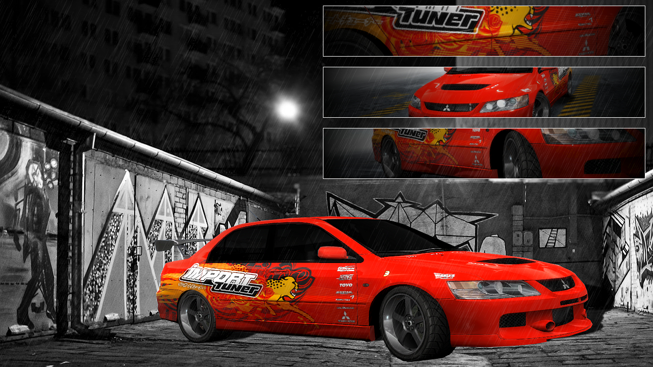 Fajny, tylko ten czerwony z tym vinylem tak trochę nie pasuje. Może inny odcień by to załatwił? Po za tym obróbka wszystko psuje, jest po prostu paskudna :/ A auto stoi na jednym kole. Dam te 5-