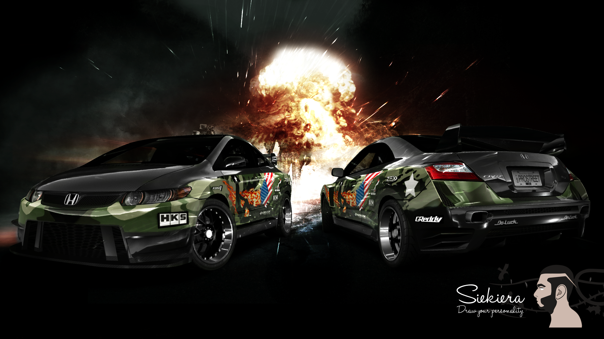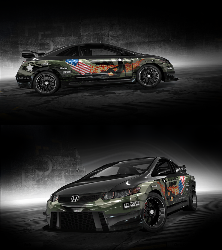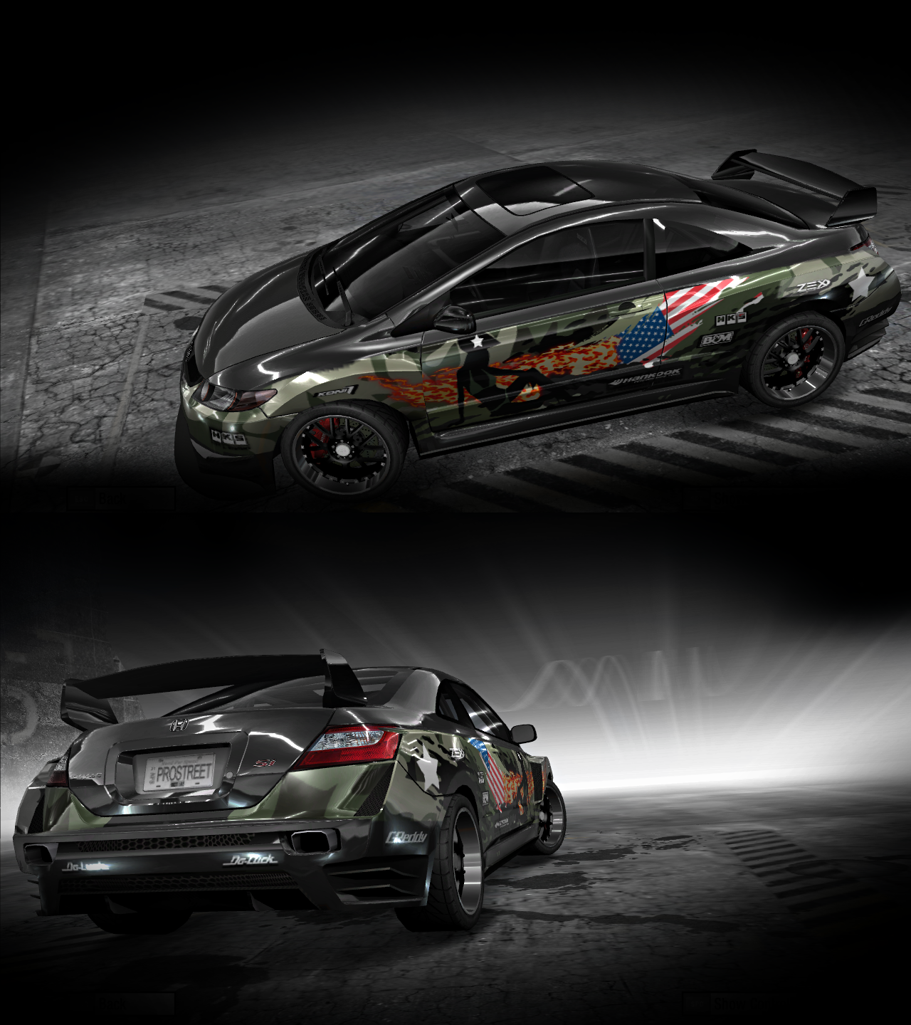 Czester - w ProStreet jest 20 warstw na vinyle. Nie ma gradientów, więc nie ma jak zrobić tak efektownego płomienia. Musisz bardzo kombinować, by chcieć cokolwiek uzyskać. Mogłem pokombinować w japońskim stylu, ale - jeśli nikt nie wie - mimo, że Honda jest japońska to Civic Si jest autem produkowanym pod rynek amerykański. Jako artysta, grafik i przyszły projektant nie wykorzystuję oklepanych motywów, stąd prace pod moim tokiem myślenia typowe nie będą.