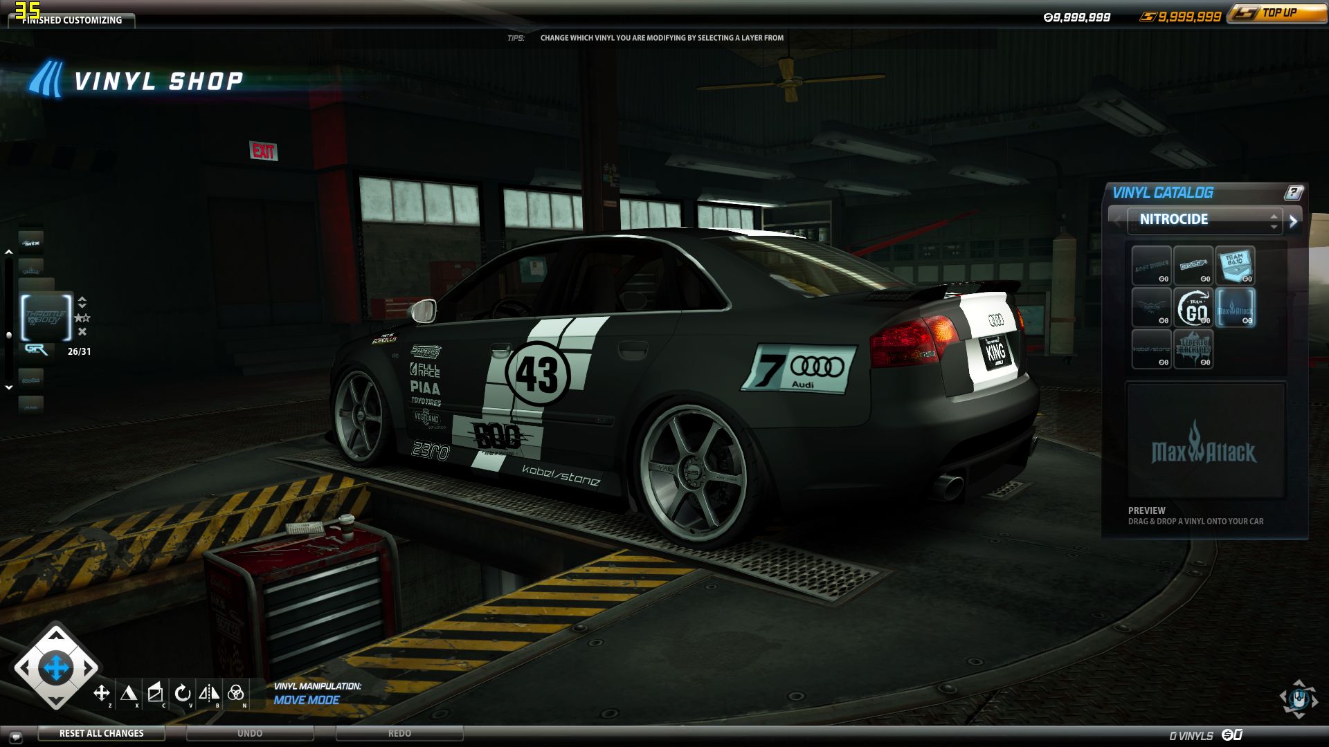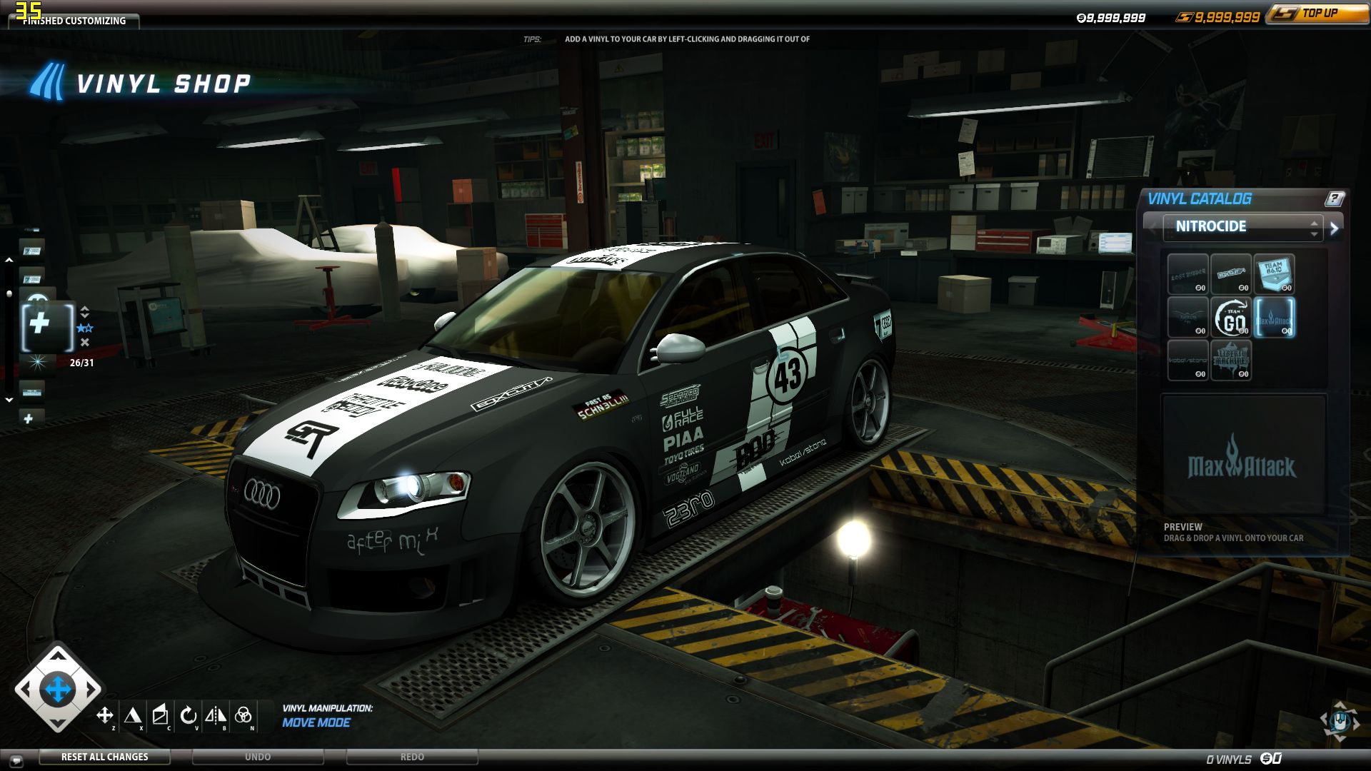 Za bardzo skupiłeś projekt na sponsoringu. Jest przez to schludny, ale nie pasują mi przez to takie rzeczy jak numer, który umieściłbym w kwadracie i bardziej stylizowaną na NeedForSpeed'owską czcionkę. Wprowadziłbym tu też kolory - popróbuj ze stalowym i bordo, wyjdzie fajne połączenie. Aha, nie opieraj vinylworku na dachu, bo z gamerskiego punktu widzenia szkoda na to warstw, a z realistycznego - dach nie jest dobrą powierzchnią reklamową.