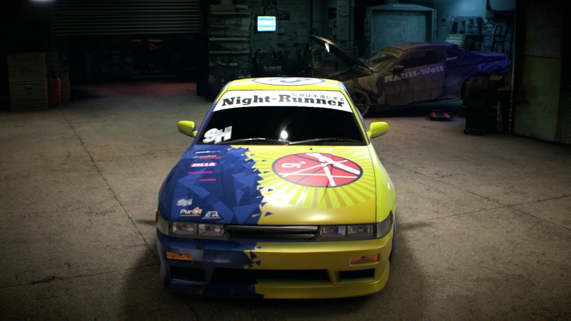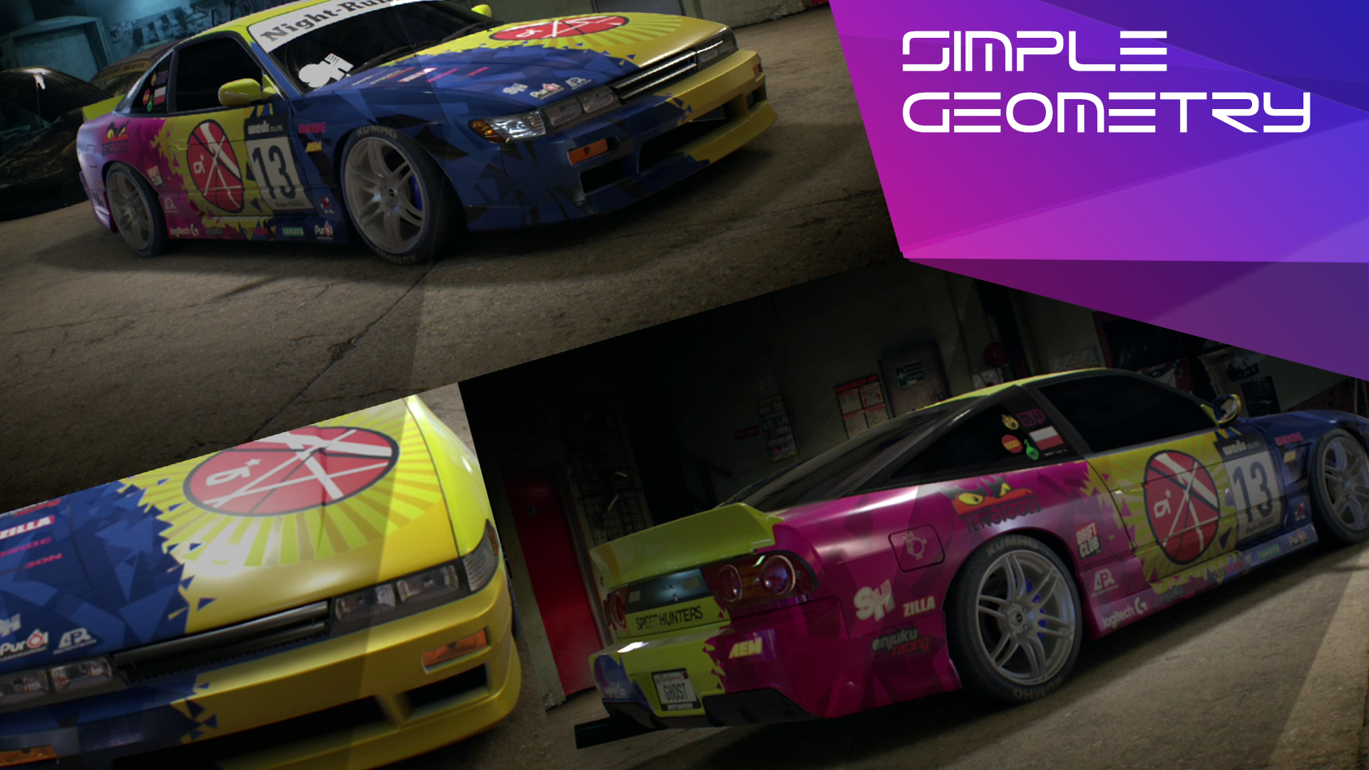 Simple geometry... to takie moje okrojone sterometry... same kolorki i dobór części supi, ale popełniłeś kilka rażących błędów. Te promienie odchodzące od kół są ohydne i same koła też - a wnioskuję że to główny motyw. Sponsorzy do tego jakoś tak za przypadkowi. I ten Night Runner... to nie wygląda jak Night Runner, to wygląda jak auto na trackday.