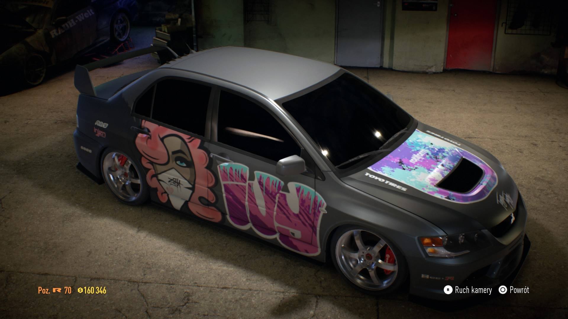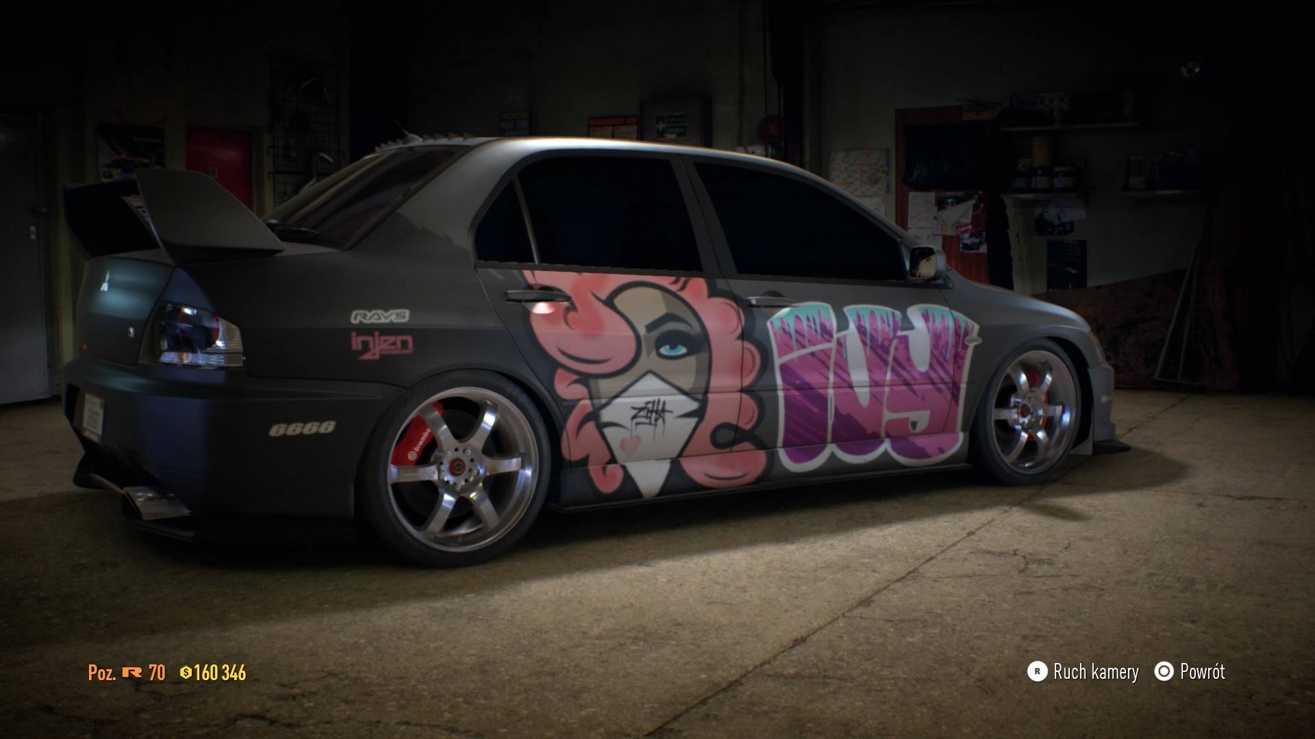 Dominik - to co mnie tu boli to to, że mam wrażenie wzięcia przez Ciebie Evo ot tak jako powierzchnię reklamową, która nie do końca koreluje mi z "panią Ivy". Nie myślałeś na MX-5, czymś bardziej sexy? Motyw wykonany mega starannie, spędziłeś nad tym więcej niż ja nad swoimi "malowidłami" (tak, 6-7h max), ale ten gdzie-nie-gdzie sponsoring to dodawanie takich bezsensownych smaczków "byle by był jakiś tuning". Wiem że technicznie wrzucenie kleksa pod napis było niemożliwe (bo go wykrajałeś), ale nie myślałeś nad jakimś - gustownym - daniem jakiegoś perłowo-łososiowego akcentu z przodu nadwozia? Te 10-12 warstw by się jeszcze na coś zdało myślę. Ode mnie idzie dycha za to, że wreszcie ktoś rusza w tym kierunku w nowym NFS i robi dobrą robotę.