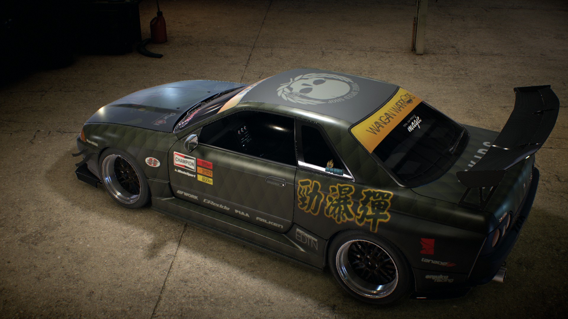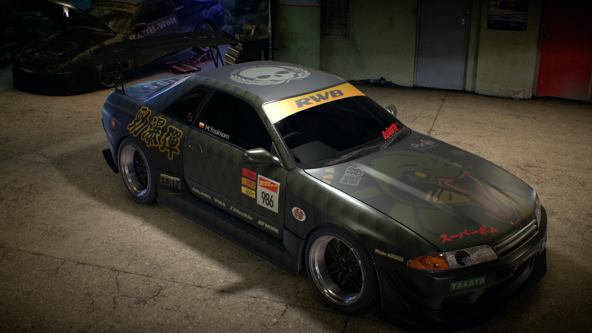 No cóż, postanowiłem odpocząć od Payback'a i wróciłem ponownie do 2015. Wybrałem starego, dobrego Nissana R32 i przerobiłem go pod Time Attack, co widać po sporej ilości spoilerów. Głównym motywem jest wąż, co widać szczególnie na masce. Jeśli chodzi o tło na boku auta, to zrobiłem coś podobnego do skóry, myślę, że wyszło całkiem przyzwoicie.