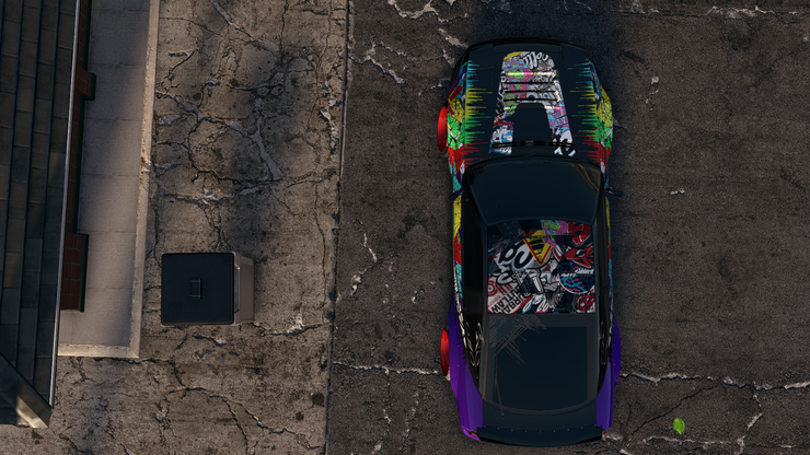 Kolorowe polygony bardzo fajnie wyglądają, ale maska i dach do mnie nie przemawiają, stickerbomb jakoś nigdy do mnie nie przemawiał... Przyglądam się temu bodykitowi i dziwię się czemu przód od BN jest z progiem i poszerzeniami od RB :p