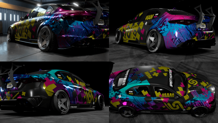 Nie wrzuciłem nic od ponad dwóch lat - i z racji zajaraniem klimatem Heat (i urlopu), co pewnie i Was dotyka, przygotowałem serię kilku projektów. Jeden team, z nawiązaniami do klimatu NFS Heat, cały skupiony na asymetrii malowania i potraktowaniu samochodu nie jako bok/maska/tył/dach/etc., tylko jako jedna całość. Stąd też posklejane fotki, bo takich malowań w trzech się nie uchwyci.