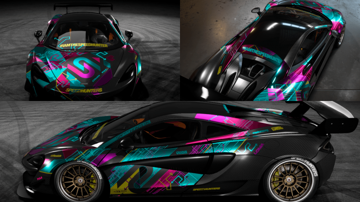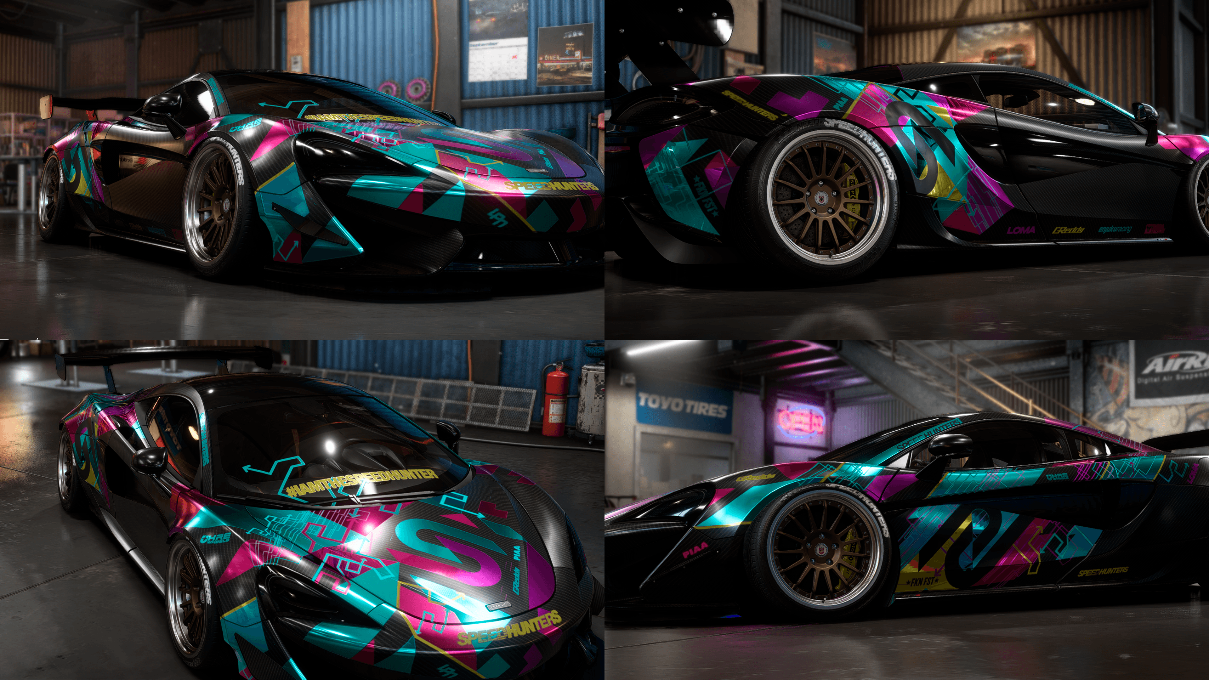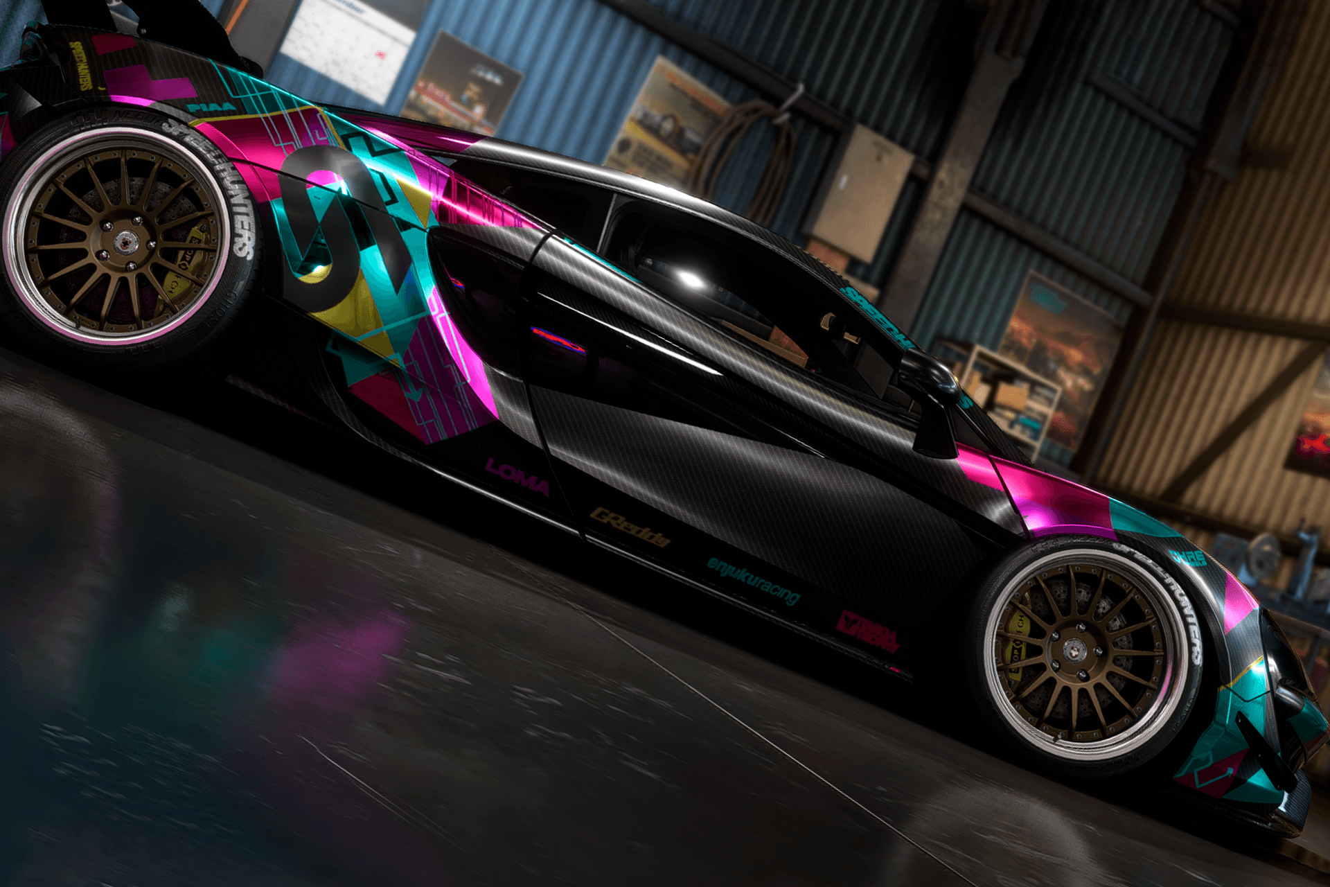 Turn up the Heat, czyli oczywiście NFS'owy uliczny racecar - zwłaszcza na noc - i na potyczki z policją. W stosunku do Giulii, tu poza nieco innymi formami, dochodzi nadwozie całe w carbonie i metalizowane lakiery bez gładkości. Auto to oczywiście McLaren 570s.