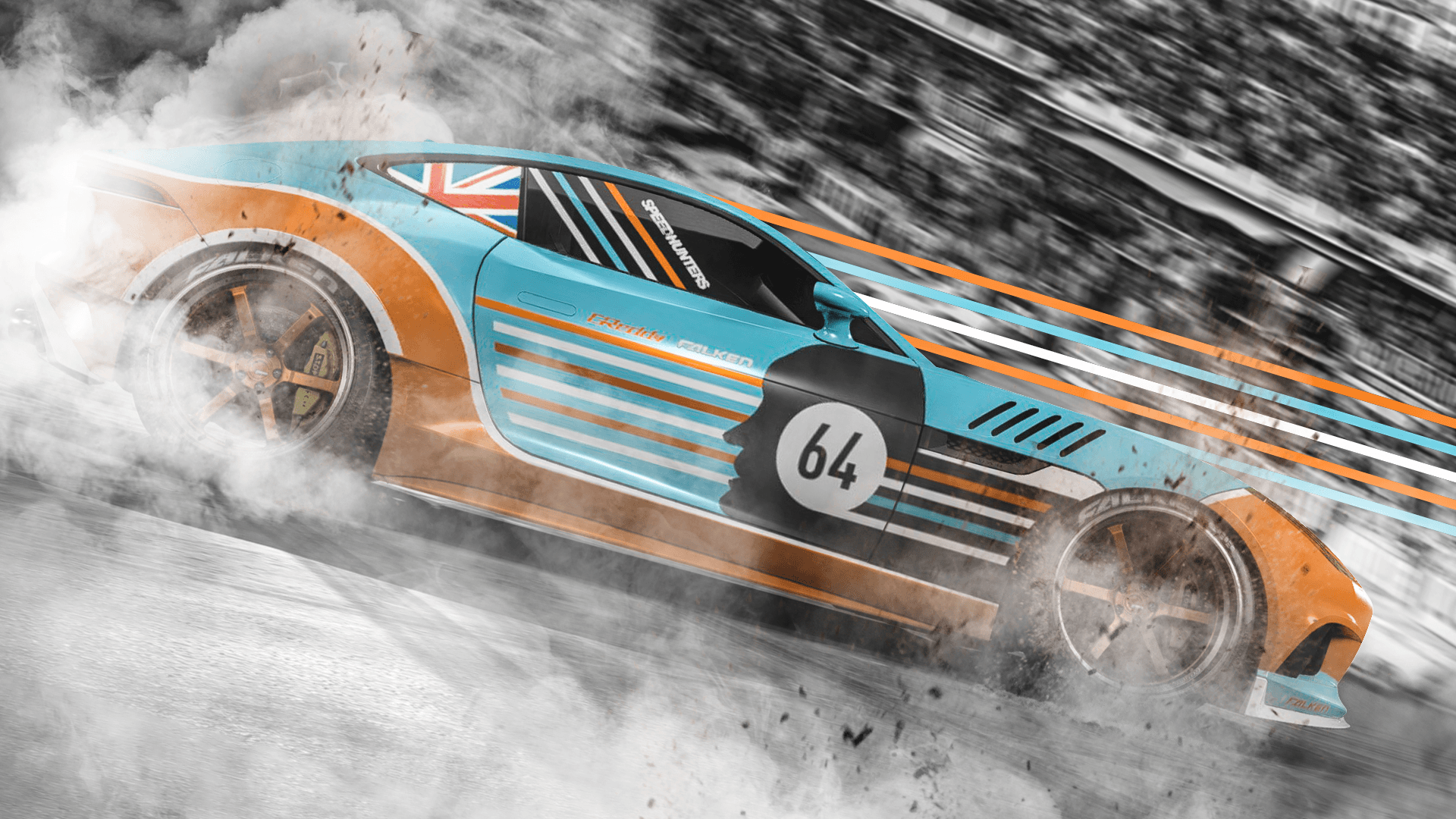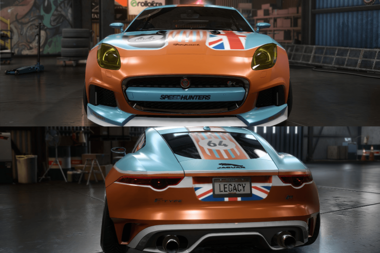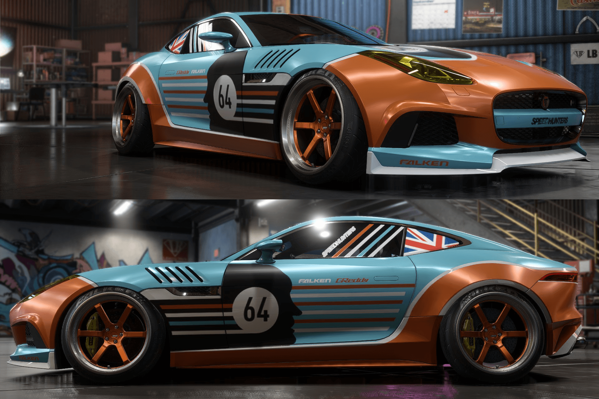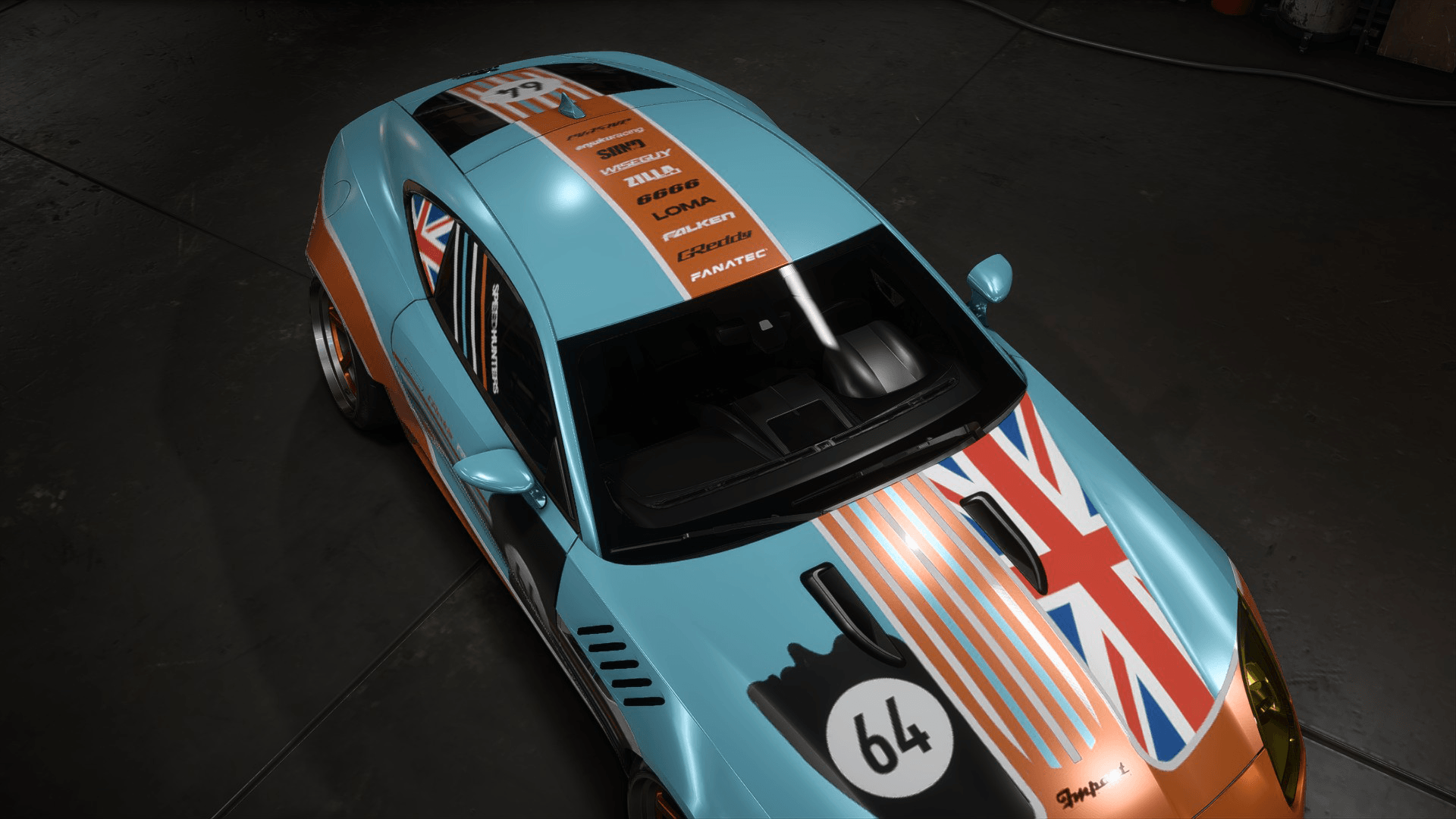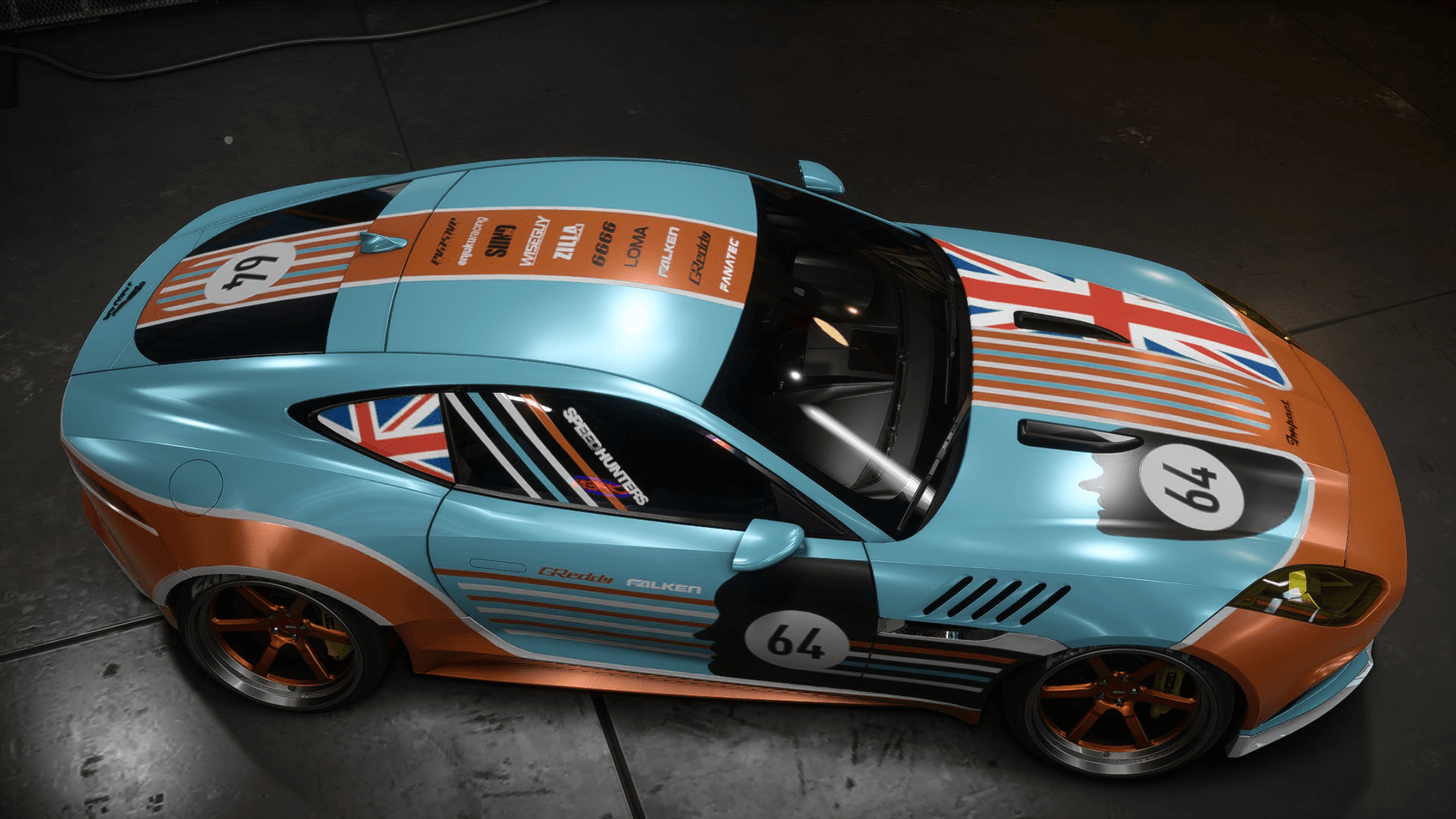 Znowu wziąłem na tapetę auto z mojego starego TF, tym razem to był TF z Chadem na 911tki w S2U, o blacklist chyba. Był tam subtelny racecar z motywem brytyjskiej flagi i kształtem twarzy jako tło pod numer wyścigowy. Poszedłem o krok dalej - sięgając po wiadomo jaką kolorystykę, dokładając swoje do motywu Gulfa. Sięgnąłem po F-Type, bo to fajna, współczesna interpretacja E-Type, więc malowanie też mialo być fajną, współczesną interpretacją wiadomego motywu, z domieszką tamtego 911.