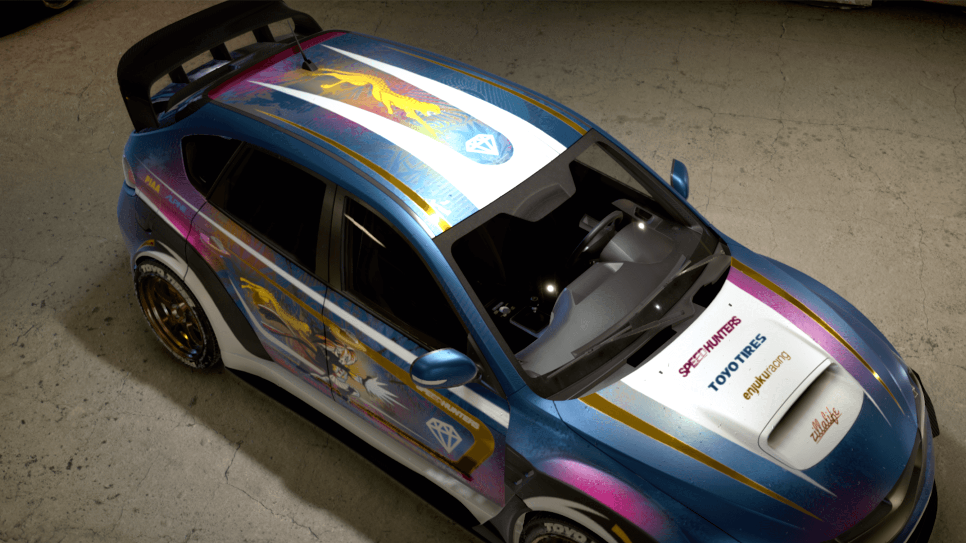 Fajne kolorki, pasują do siebie i ładnie się uzupełniają. Złoto na klapie bagażnika trochę na krawędzi dobrego smaku, nie pasuje mi do reszty auta, jest go za dużo. Ten tygrys obok postaci trochę mi nie pasuje, ale bez niego może byłoby za pusto. Ogólnie mam mieszane uczucia, z jednej strony nie ma szału, a z drugiej te kolorki przyciągają.
