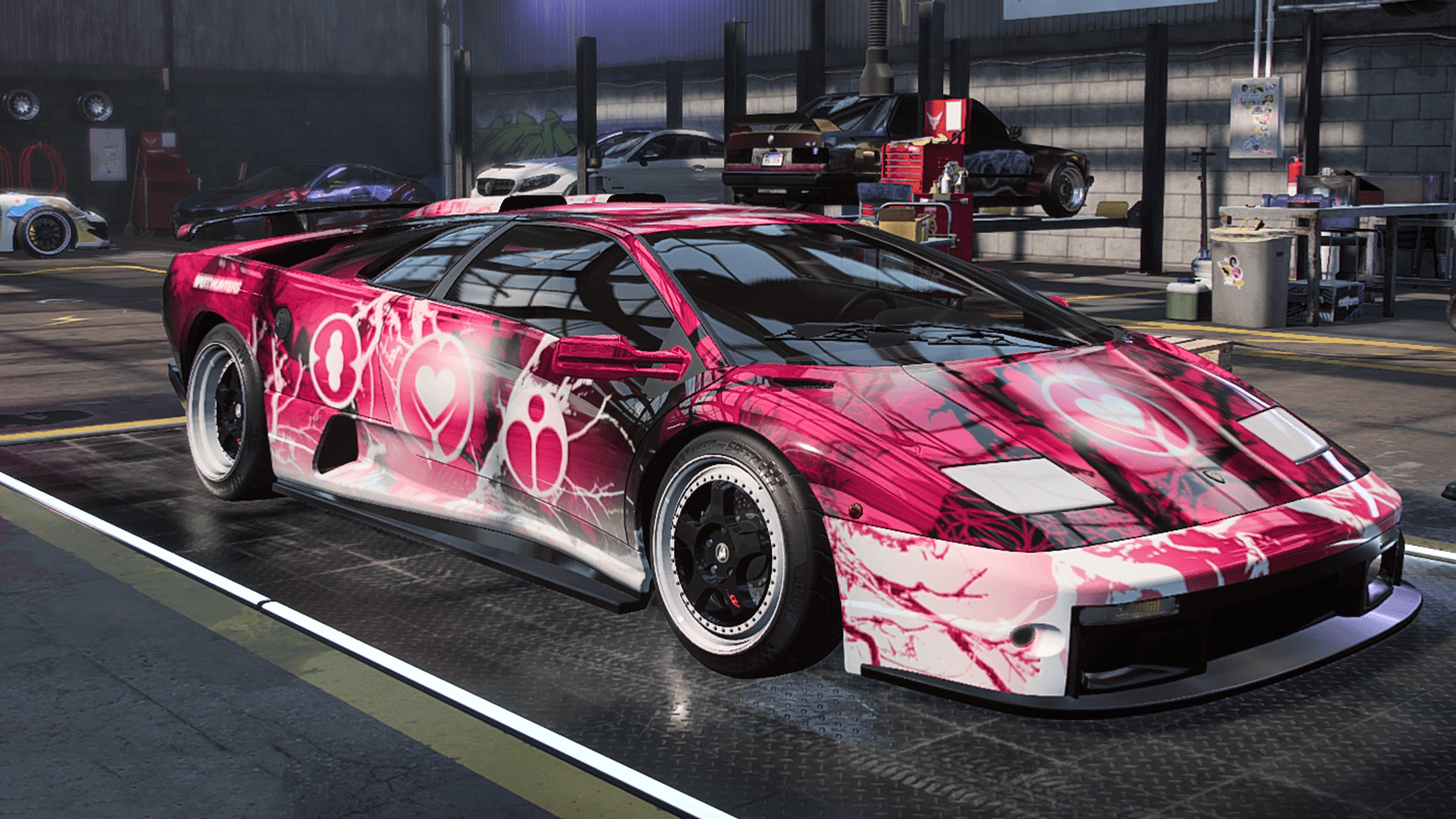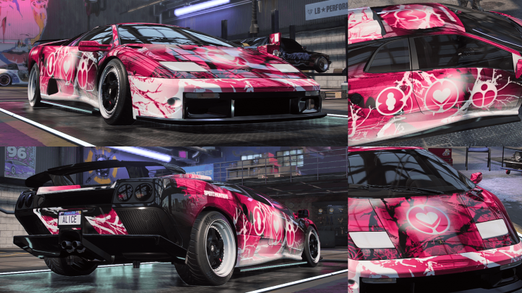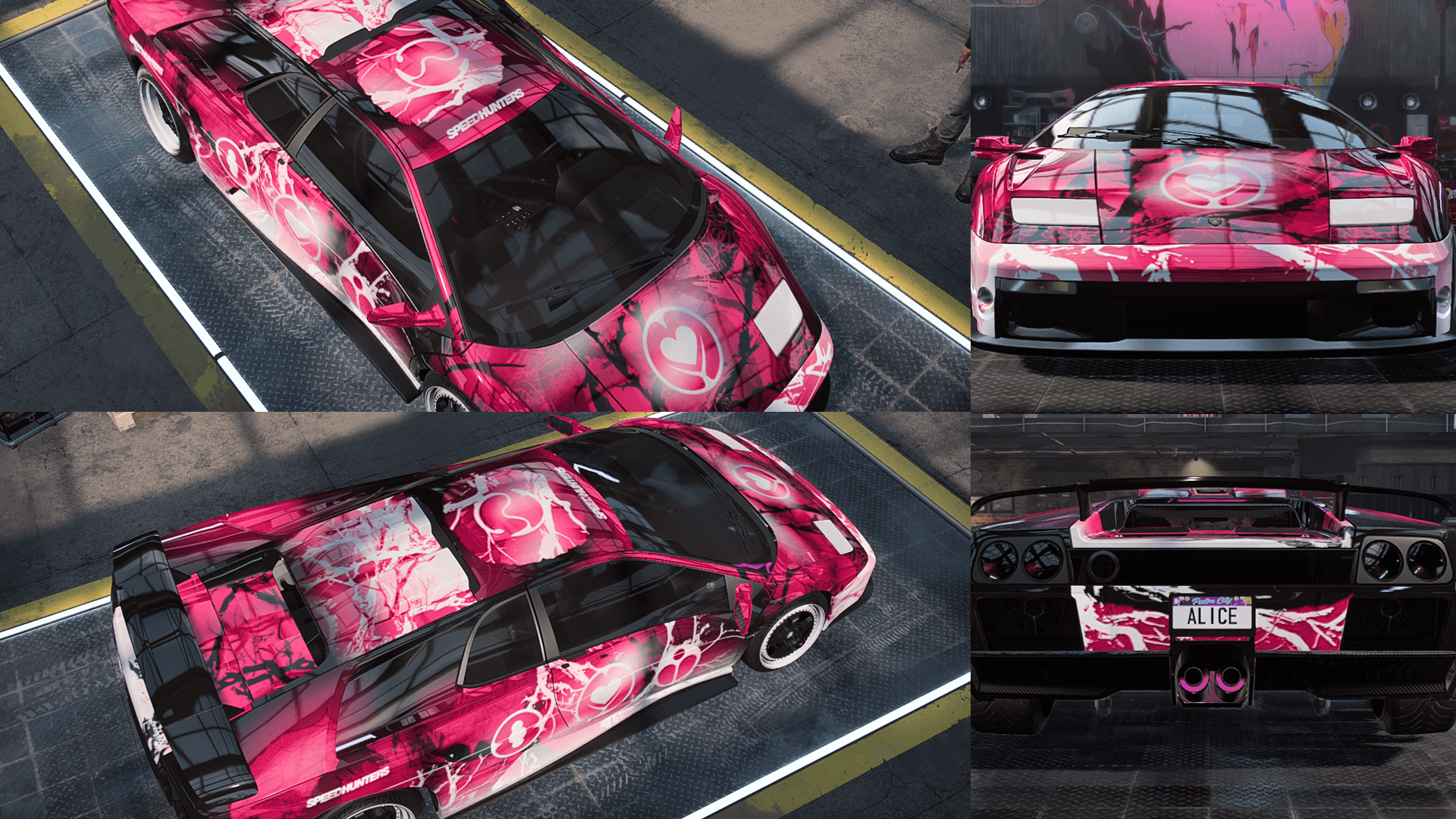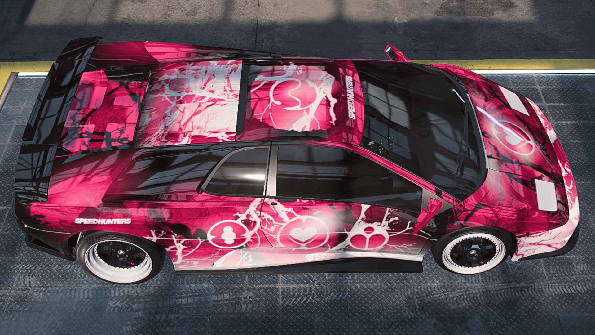 Pomijając niezrozumiałe dla postronnego inspiracje, jest to po prostu ładny, kompletny czarno-różowy wrap na Diablo. Nie żeby Diablo ułatwiało tu sprawę w jakiś sposób, przeciwnie wręcz, myślę, że trudno namalować na tym samochodzie cokolwiek i nie zasłużyć na lincz. Tu się udało, choć wciąż wolałbym tego auta nie oklejać wcale.