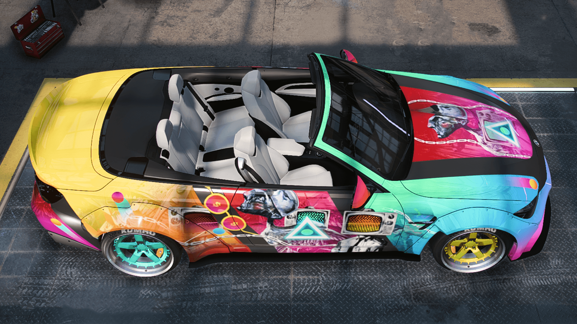 Na kolejny "rozruch" auto dość utopijne i społeczno-polityczne, niczym zaślepione gęsi w różowych okularach, tworzące społeczeństwo. Media zakładają nam "różowe okulary" i wciskają kit, tworząc iluzję dobrostanu. Mam nadzieję, że zobaczycie w tym malowaniu coś, co chcieliście zobaczyć, a ja wiem, że pomysł na ten projekt pojawił się przed zabraniem do tuningu w Heat - i wiedziałem, że muszę go zrealizować, koniecznie na kabriolecie z jasną tapicerką, która przyjemnie dopełnia się z pozornie iście sielskim, wakacyjnym malowaniem.