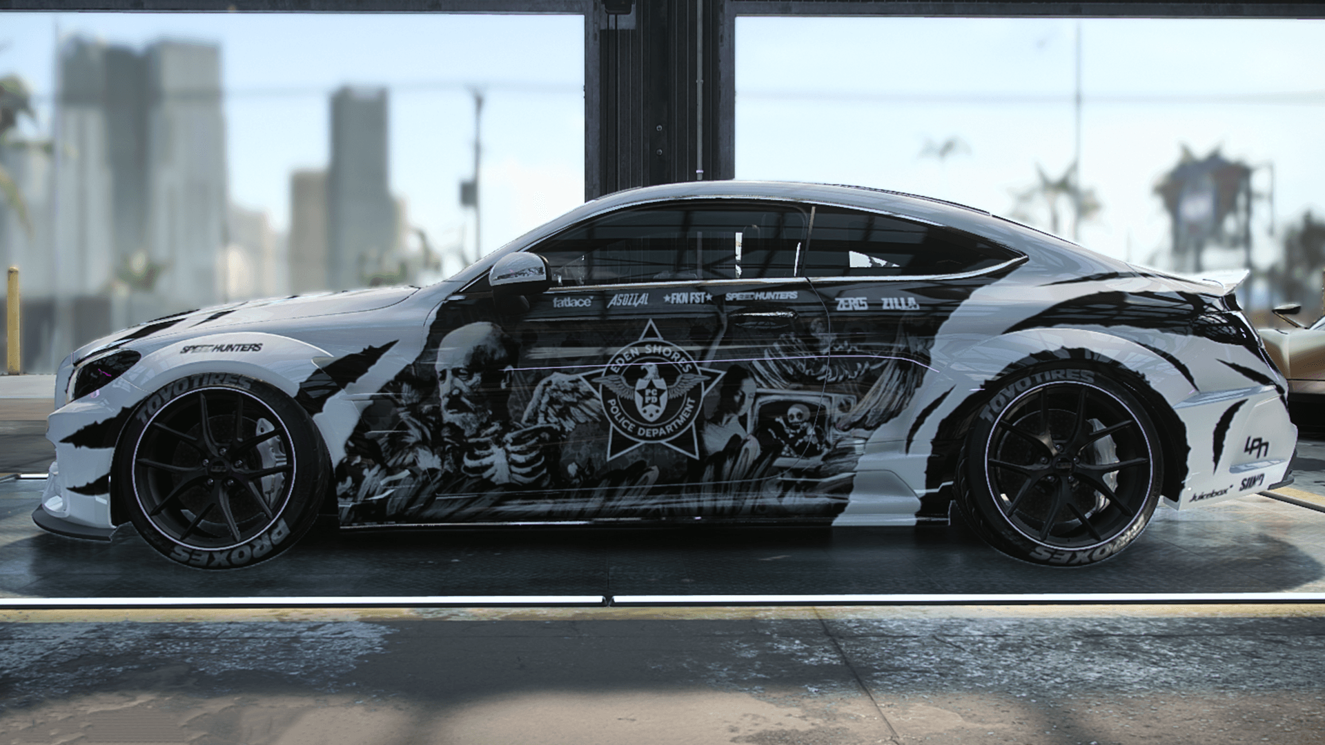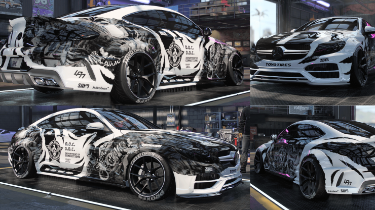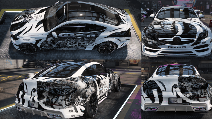 Coś mniej "szablonowego" - totalnie monochromatyczny i do tego asymetryczny projekt, który nie jest oparty na geometrycznych kształtach. Pomysł na całe malowanie wziął się dużo wcześniej, mając być zrealizowanym początkowo na Cudzie - kończąc na C63 AMG, które dla mnie jest czymś w rodzaju europejskiego muscle-cara.