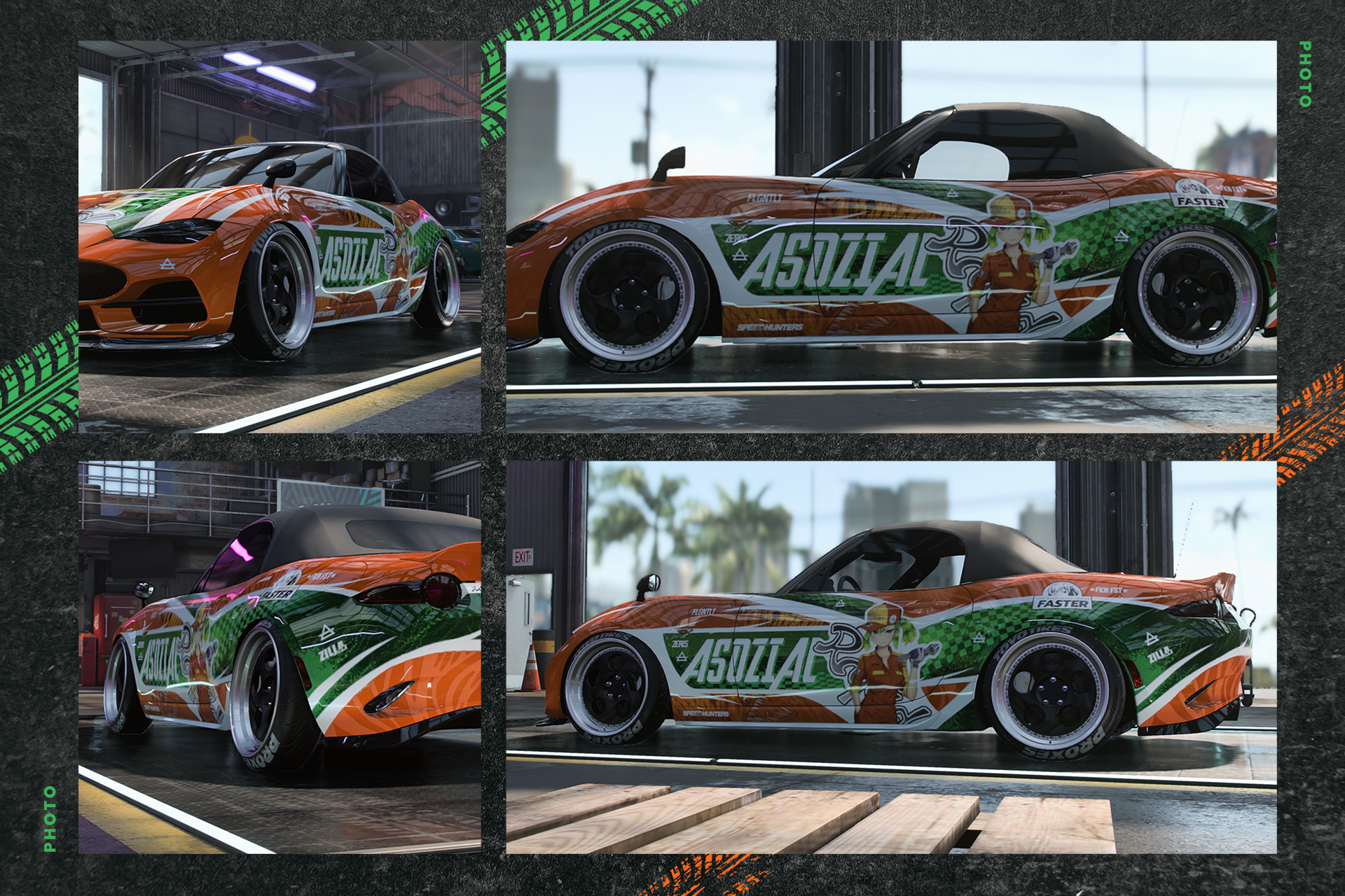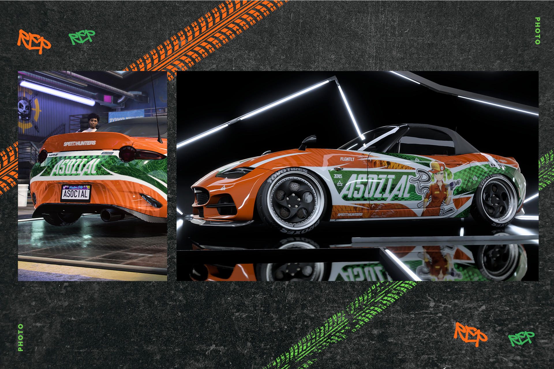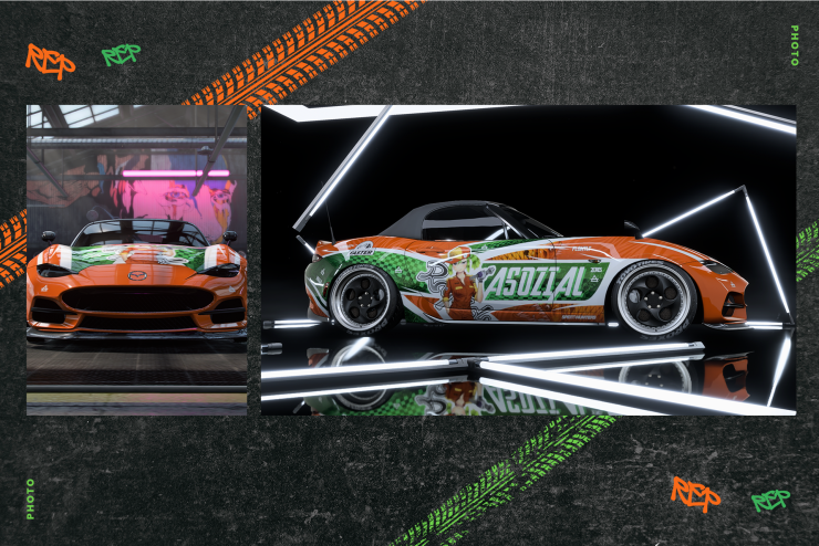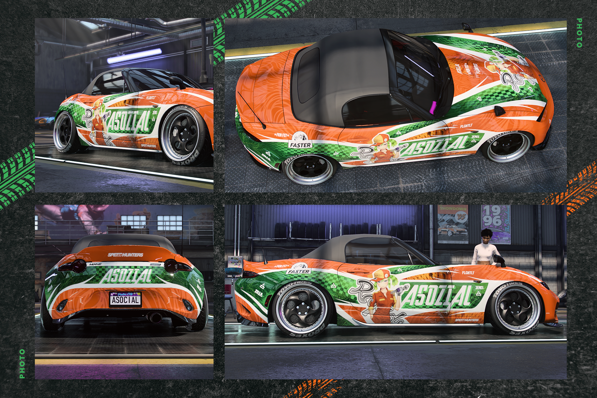 Anime-niby-baba z jasnymi skojarzeniami z hentai. Kolory przypominają trochę legendarną 787b, ale nie było to celem - bardziej idę tu w stronę połączenia kolorystycznego, którego jeszcze nie było (ale kiedyś to było). Na pewno jest to trzecia najlepsza MX-5 (ND), bo - przyznam sam szczerze - wolę te od Radzia, ale nie będę się bawić w radziostyle, bo też sam inaczej czuję kompozycje na autach i inne kierunki mi w głowie.