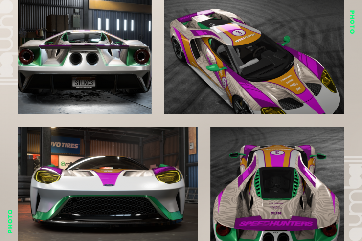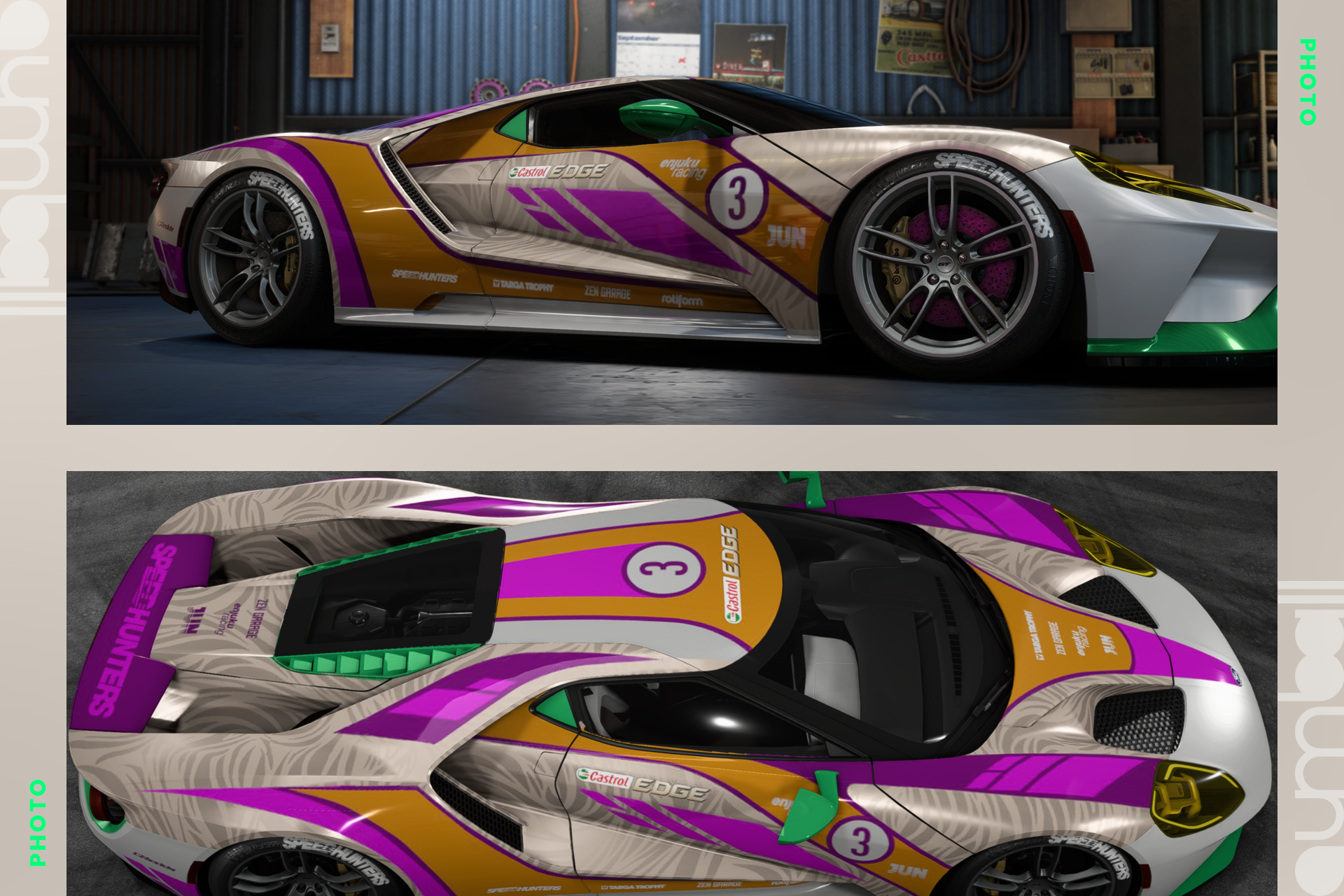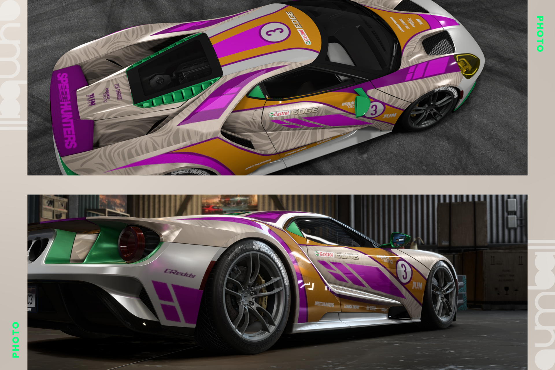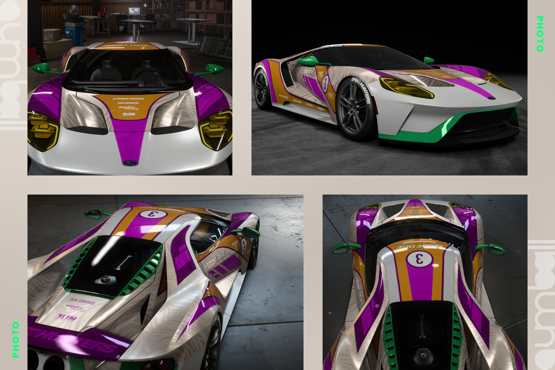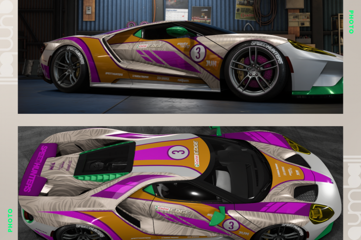 Co do samego Forda - bardzo trudne auto do robienia livery, głównie przez jego aero i w związku z tym podzielenie stref do oklejania. Trzeba myśleć o oklejeniu pod wieloma różnymi płaszczyznami i kątami (w odróżnieniu od klocowatych JDM'ów) - kto próbował, ten wie. Puszczam oko w kierunku Jaguarów LMP z malowaniami Silk Cut, a zielonym akcentem w kierunku jednego konkretnego modelu. Zarówno samo auto, jak i livery są dla mnie ucieleśnieniem tego, co powinno się pojawić na gumball i czym można wybrać się w długą podróż, jak i jeździłbym takim czasem na daily, póki kręgosłup by mi nie padł.