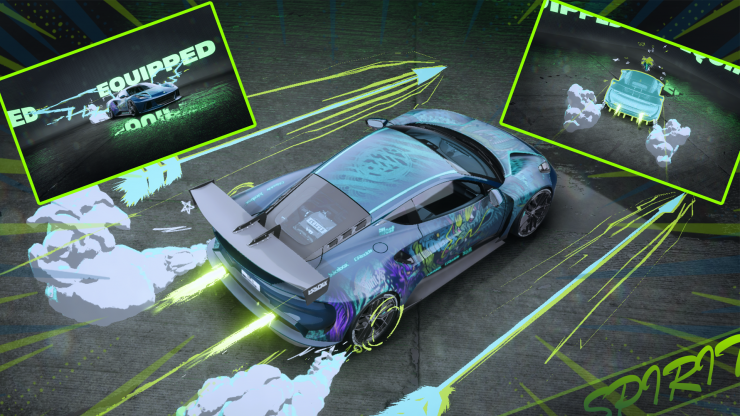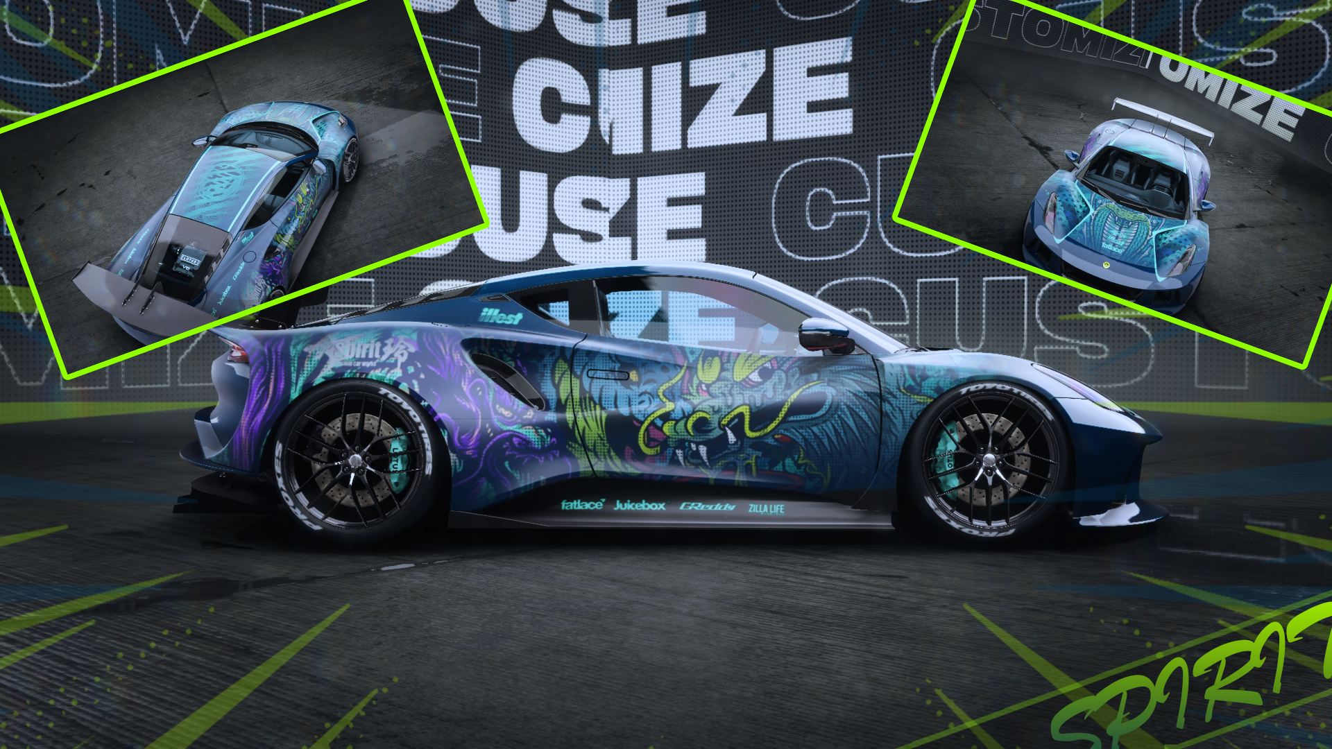 Nieźle, tylko cały czas jest ten problem, że troszkę za pusto - może spróbuj z którymiś dowalonymi naklejkami pokroju tych kolorowych z astronautą czy tymi, gdzie masz kilka wrapów w dokładnie tym samym stylu? Chodzi o to, by zagęścić motyw, a w tej grze naprawdę łatwo to zrobić. Tak samo, fakturę z dachu mógłbyś w prosty sposób powtórzyć na całym tylnym i przednim zderzaku, zwłaszcza, że dość mocno używasz gradientów i fajnie się to blenduje. Nie bój się też nakładać sponsoringu w miejsca, na których główny motyw przykryty jest trochę gradientem - sam teraz tak kombinuję pracując nad serią i efekty są super. Póki co są z nim małe zgrzyty - Greddy jest za blisko klapki wlewu paliwa i ten biały Spirit nie siedzi; może w ogóle pyknęliby tu wszyscy sponsorzy w takim zielonym, jak w elementach obróbki?