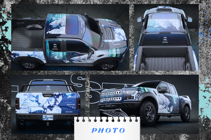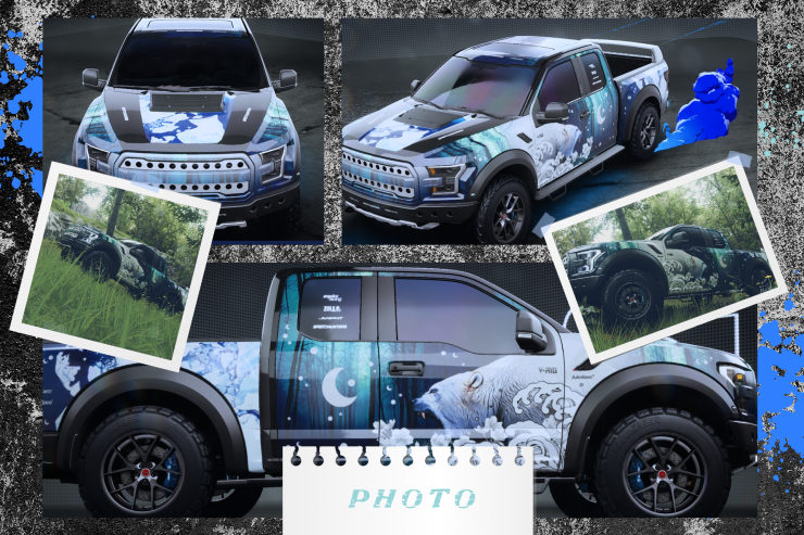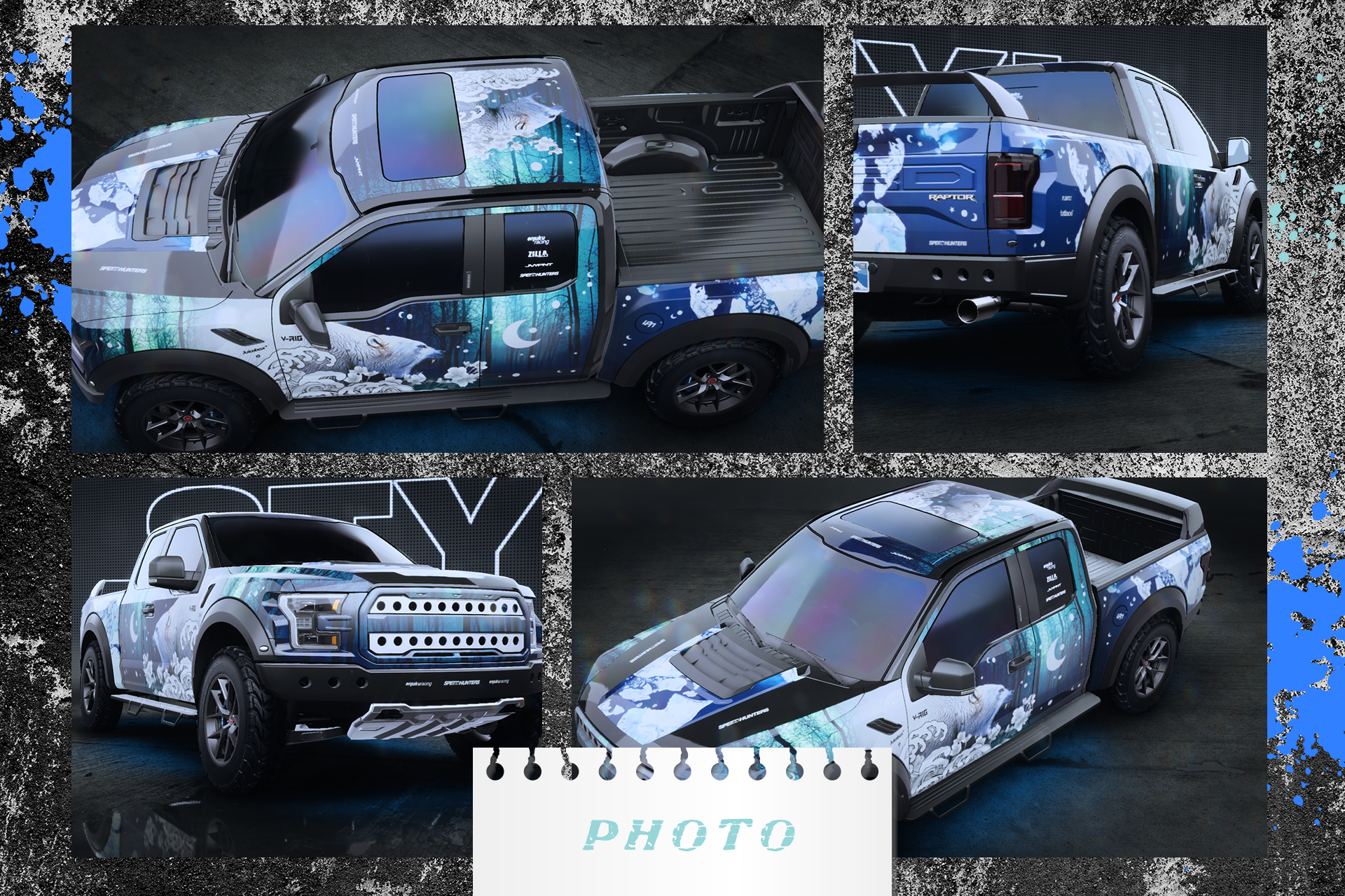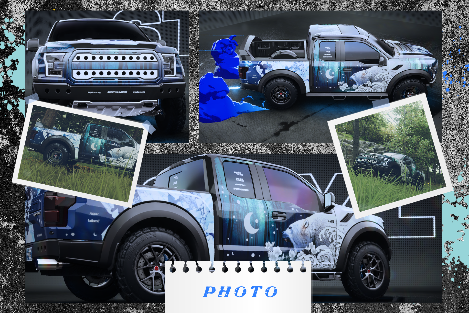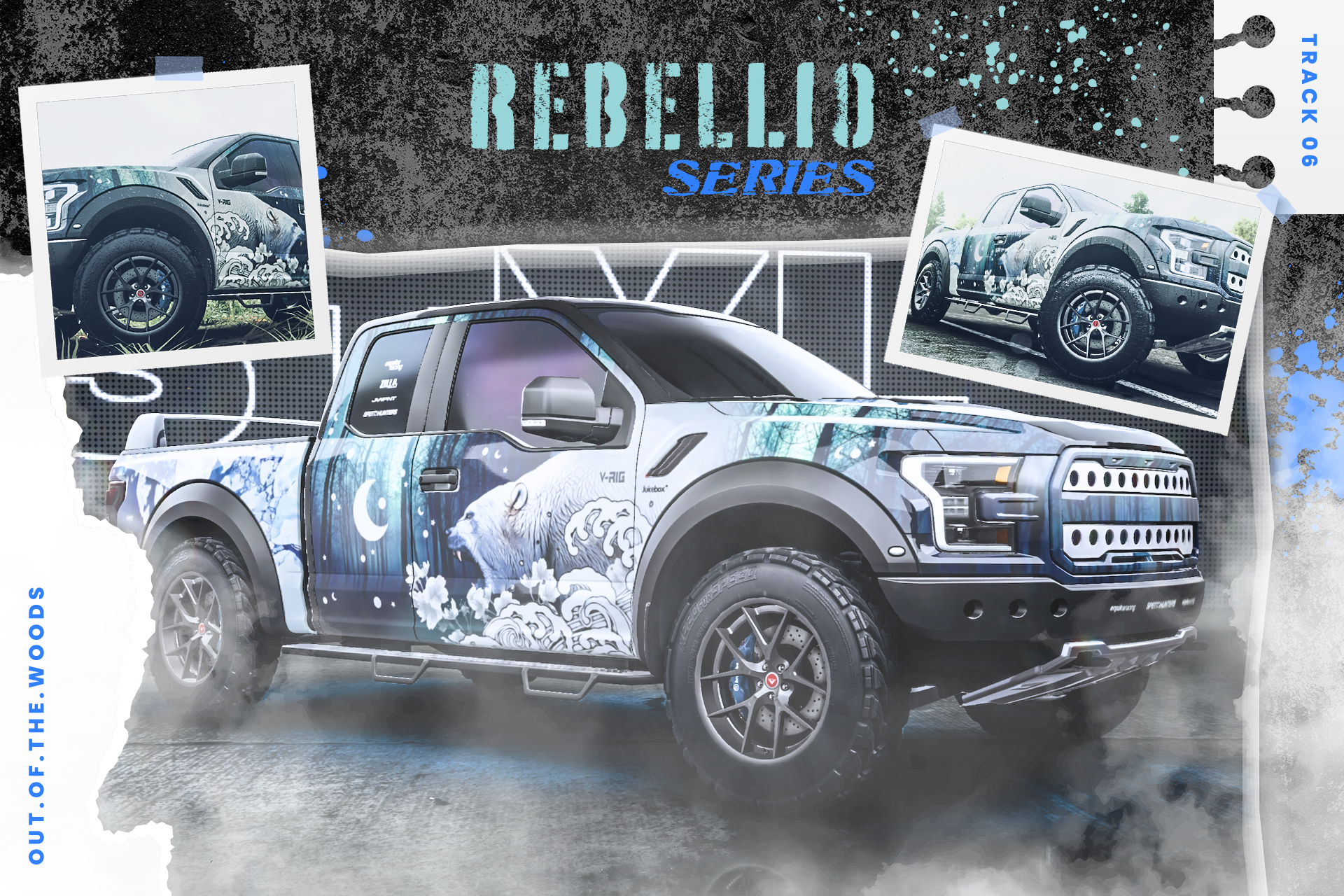 Jak tylko zobaczyłem w Unbound naklejkę niedźwiedzia i ciemnego lasu, uznałem, że wracam do pomysłu o praktycznie tej samej nazwie, który realizowałem lata temu na Audi S5 w Undercover. Od razu też wiedziałem, że to musi trafić na Raptora, by - dzięki wielkim powierzchniom - przyrodniczy motyw mógł odpowiednio wybrzmieć. out.of.the.woods to film przyrodniczy, grający do piosenki Taylor Swift o takim tytule. Tak, jak w teledysku do niej, mamy tu różne otoczenia, tj. w tym projekcie las i lodowce. Tuning optyczny jest delikatny, bo chciałem, by to auto zachowało terenowy charakter, jednocześnie mając charakterystyczne dla rebellio neon i drobne elementy typu gwiazdek, dolarów, kropek etc.