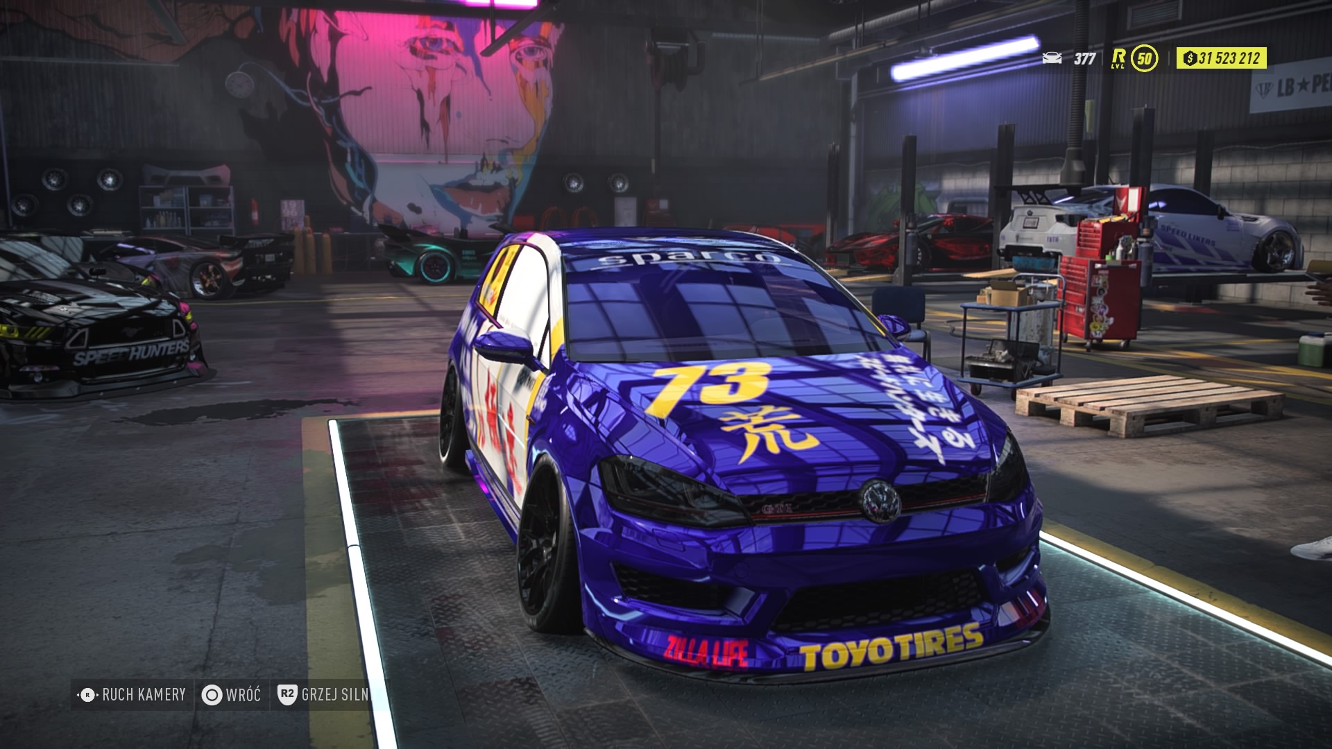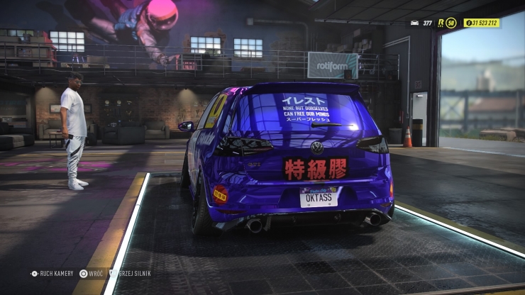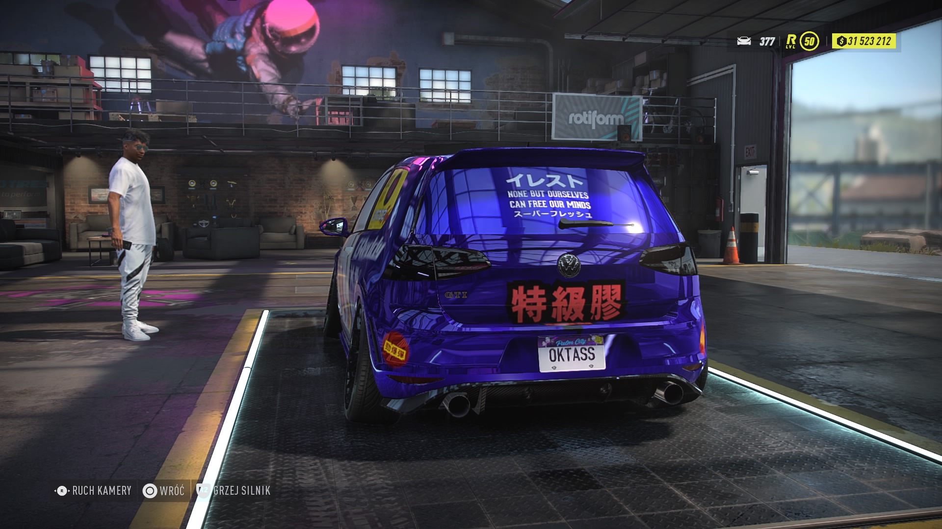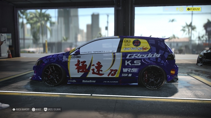 Tak bez ładu wszystko nawalone. Albo szukaj jakichś linii na aucie, zależności, kształtów, albo oklejaj mocno całość patternami czy gotowcami. Sponsorzy za duzi - bo oni nie są głównym punktem tego malowania - a tam, gdzie powinno być dużo, czyli azjatyckie znaki, numer - za pusto. No i oklejone szyby są okej wtedy, kiedy serio jest tam jakiś rozbudowany motyw, bo teraz po prostu zabudowałeś je plandeką od środka Wink