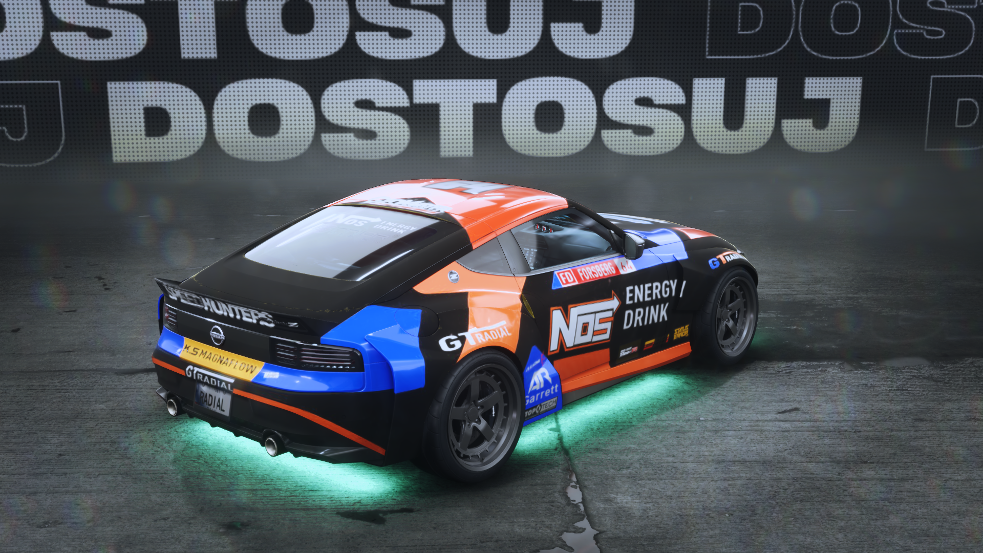 Fajnie, że sam wykroiłeś naklejkę NOS, natomiast cała reszta... Wiem, o co Ci chodziło, ale te wlepy z podstawowego fontu z ostatnich NFS psują cały efekt. Uzupełniłbym niebieskie i pomarańczowe wielokąty drobnymi rombami i pasami, zeskalowałbym naklejki sponsorów, dał ich więcej i projekt jest do wyprowadzenia.