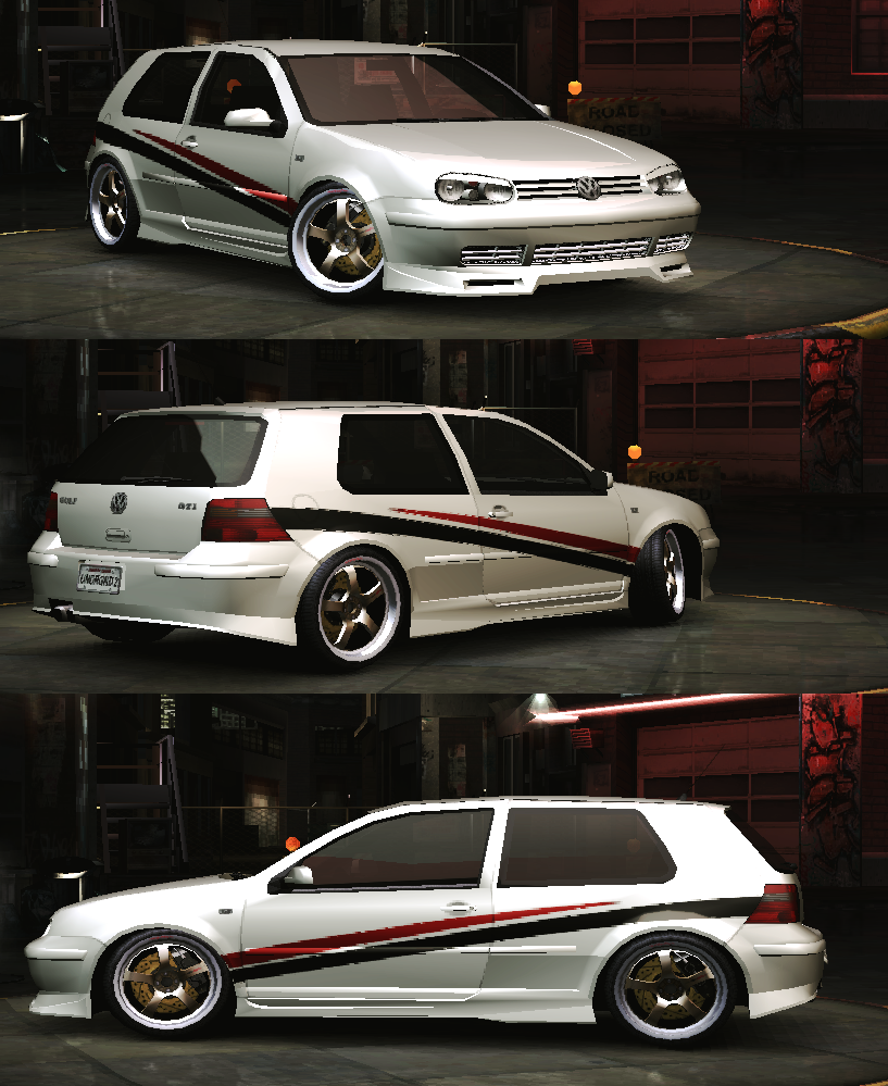 Mi się nawet ten golf podoba, chociaż białe auta z zarno-czerwonym winylem zostały całkowicie oklepane i obrzydzone przez Mc Coq'a. Poza tym mam zastrzeżenia do dwóch rzeczy - ze stylem german mi się to zbytnio nie kojarzy, a nadawanie nazw starym projektom po dłuższym czasie daje mizerny efekt.